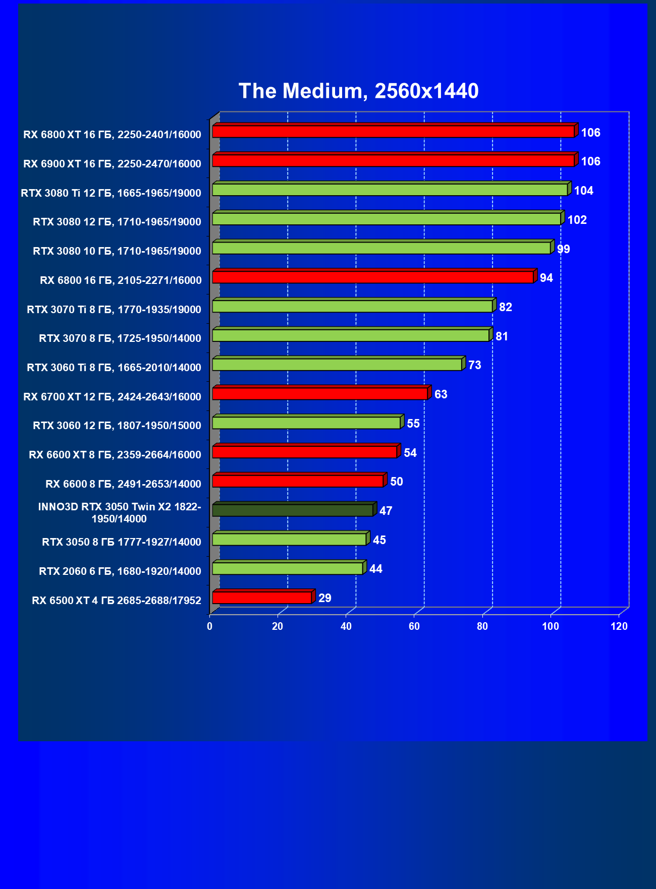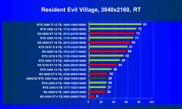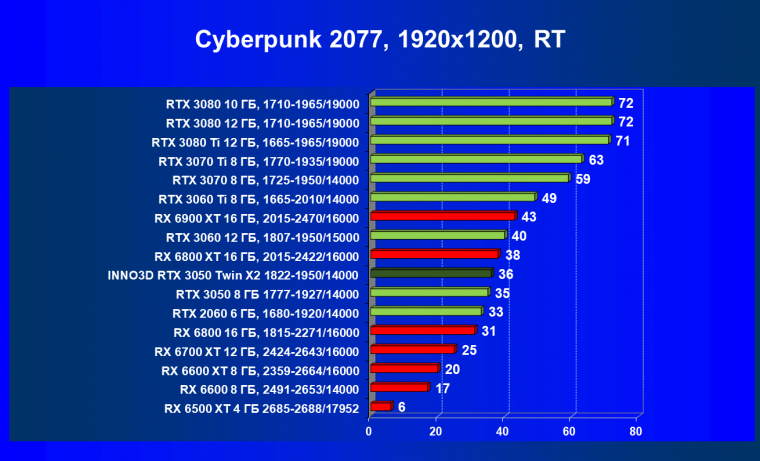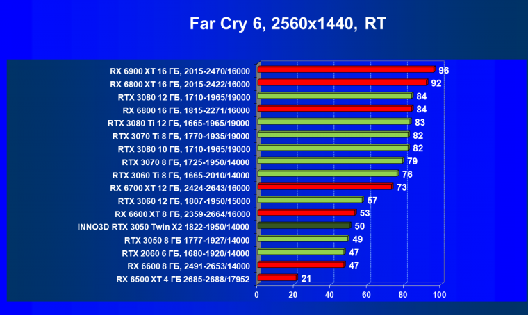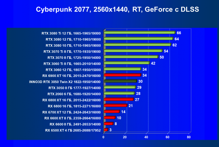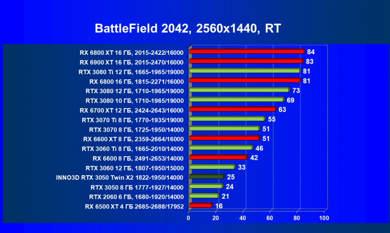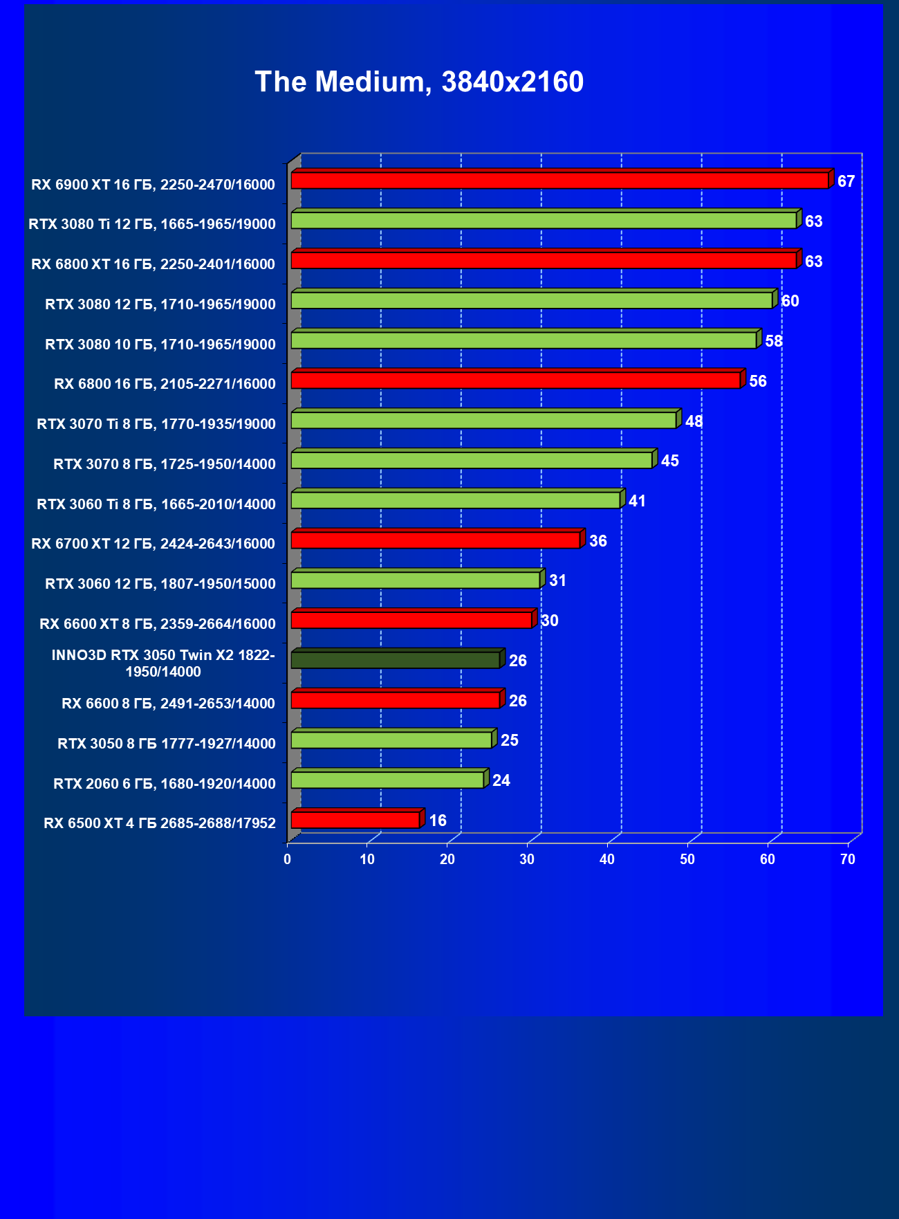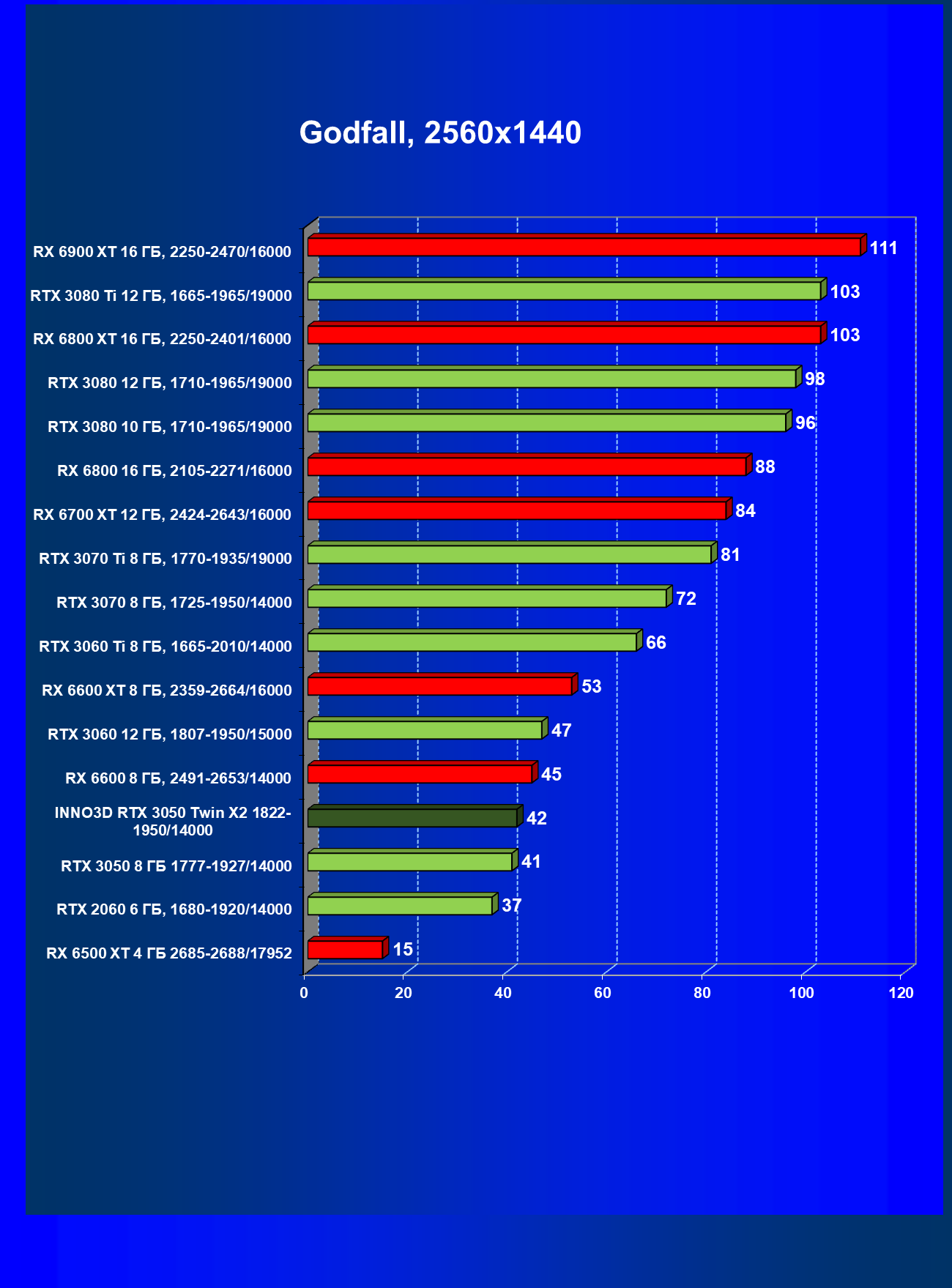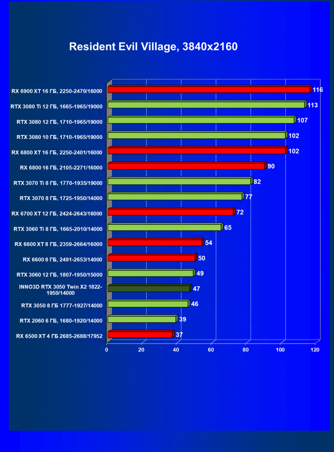 В данном случае RTX 3050 обошел не только более дорогой Radeon RX 6600, но и RX 6600 XT: даже поддержка FSR в ряде игр не помогает последнему поколению Radeon компенсировать сильное падение производительности от включения трассировки лучей. Учитывая чуть более высокие частоты работы карты Inno3D, логично смотрится лидерство этого продукта в своей группе.