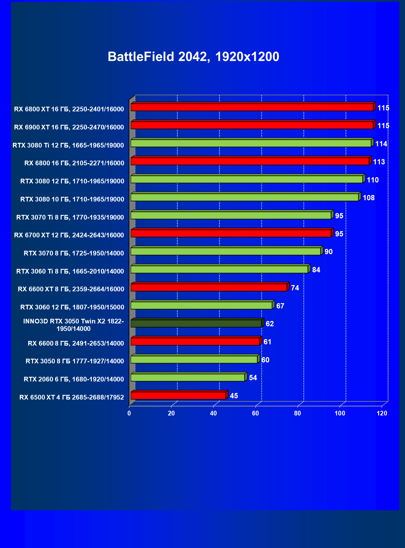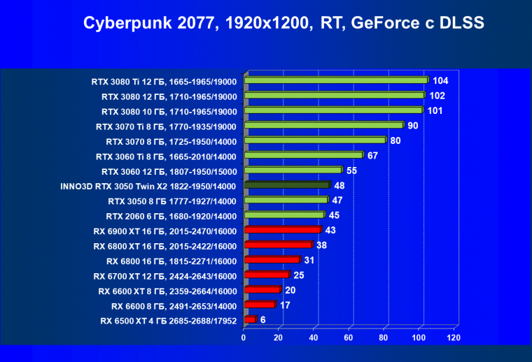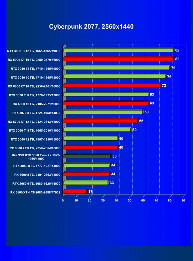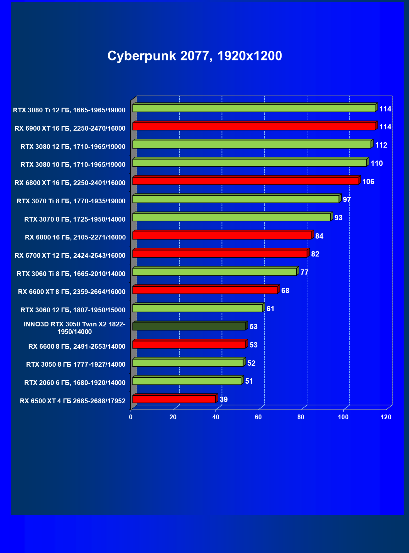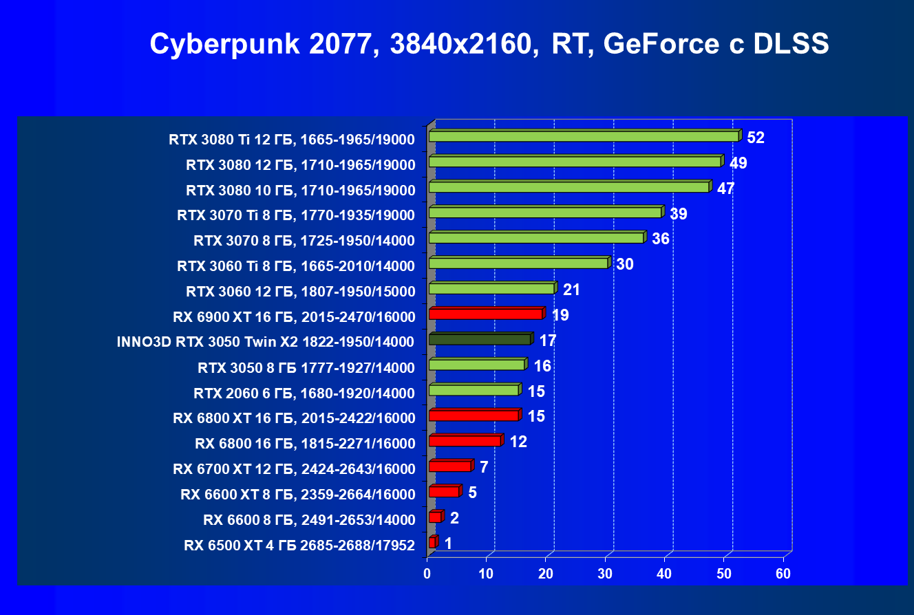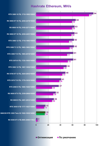 | 01 | Inno3D RTX 3050 Twin X2, 1822—1950/14000 | 47 | 330 | 70 000 |