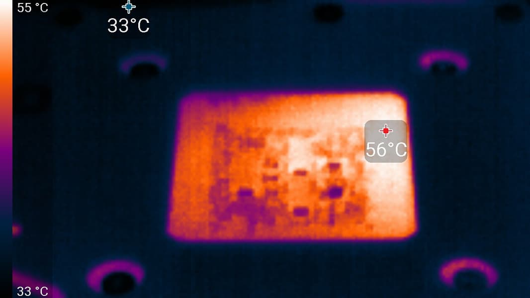 После 2-часового прогона под нагрузкой максимальная температура ядра не превысила 63 градусов, что является очень хорошим результатом. Максимальная мощность была зафиксирована на уровне 133 Вт, а максимальный нагрев наблюдался вокруг ядра (и основным источником нагрева являются преобразователи питания).