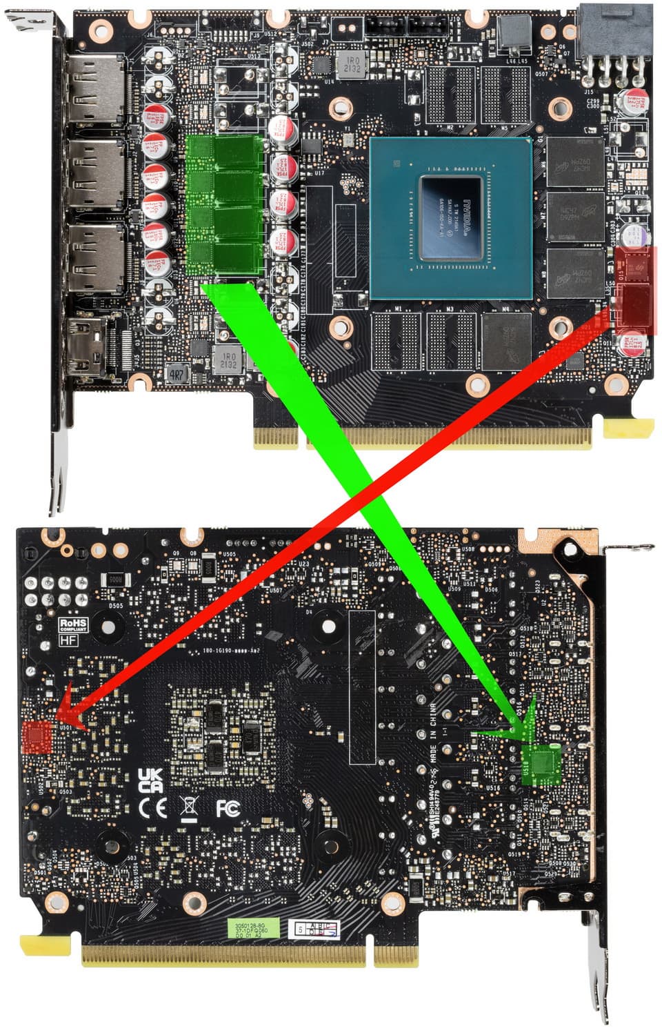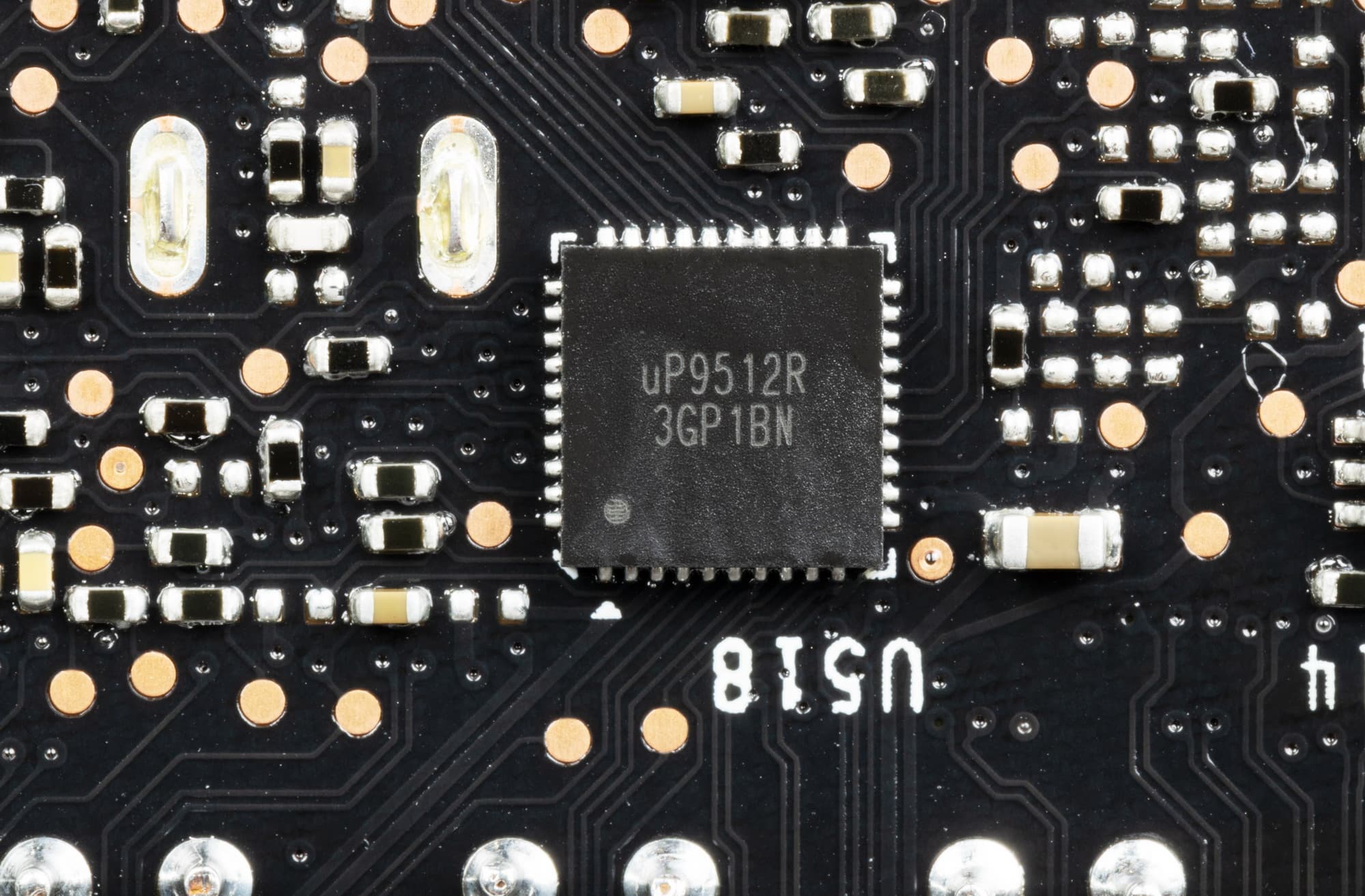Зеленым цветом отмечена схема питания ядра, красным — памяти. ШИМ-контроллер uP9512R (uPI Semiconductor) отвечает за работу фаз питания графического процессора.