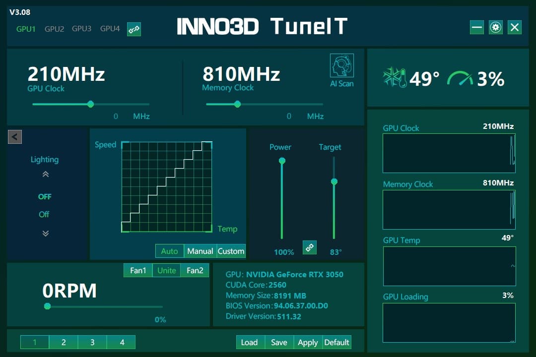 Управление работой карты обеспечивается силами фирменной утилиты TuneIT, которая традиционно предоставляет возможность управлять частотами и лимитами, а также настраивать работу каждого вентилятора по отдельности.