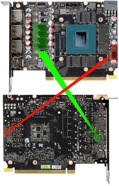 Теперь о питании. Видно, что схема питания у обеих карт имеет одинаковое количество фаз — 5: 4 фазы на ядро и 1 на микросхемы памяти (ну вполне ожидаемо от таких довольно простых продуктов). При этом на обеих PCB одинаковое количество пустых мест под дополнительные фазы (потенциально они рассчитаны на 8-фазную схему питания GPU), что может быть использовано, например, в будущем продукте типа GeForce RTX 3050 Ti. Также оставлена возможность комплектовать карты 8-гигабитными микросхемами памяти (их потребуется уже 8 штук).