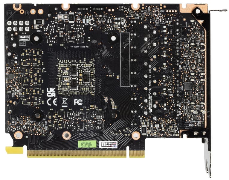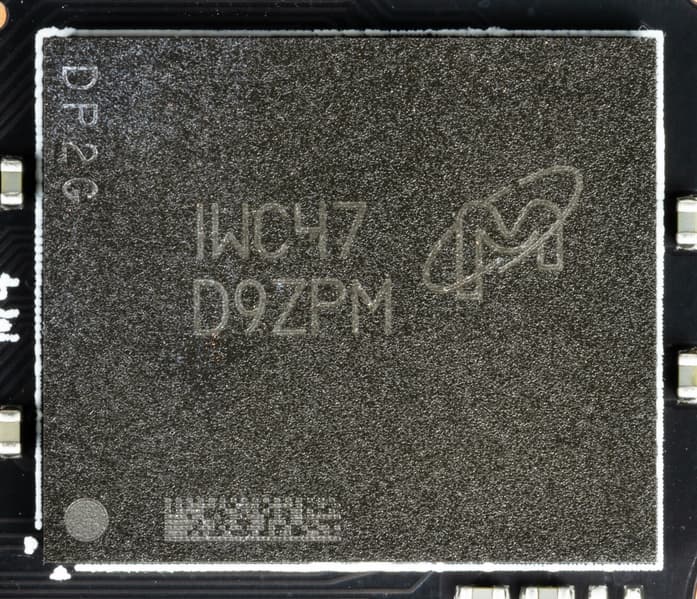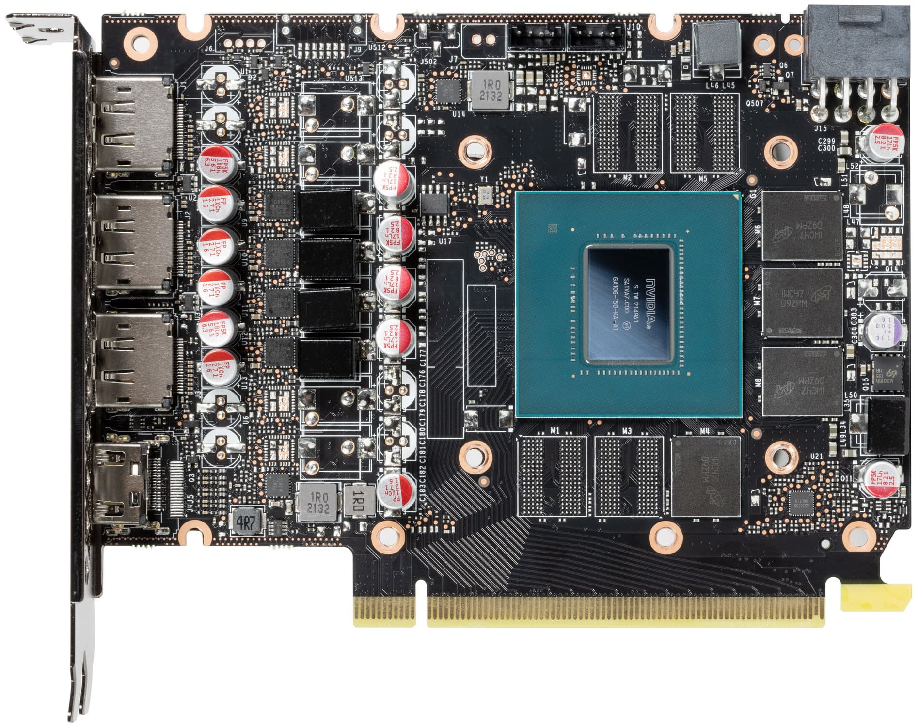 Карта имеет 8 ГБ памяти GDDR6 SDRAM, размещенной в 4 микросхемах по 16 Гбит на лицевой стороне PCB. Микросхемы памяти Micron (GDDR6, MT61K512M32KPA-14:C / D9ZPM) рассчитаны на условную номинальную частоту работы в 3500 (14000) МГц.