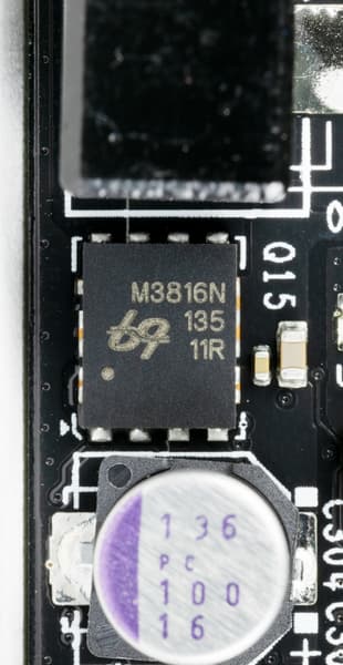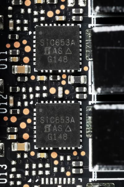 В преобразователе питания, традиционно для всех видеокарт Nvidia, используются транзисторные сборки DrMOS — в данном случае мосфеты схемы питания GPU SiC653A (Vishay, до 50 А) и мосфеты схемы питания памяти QM3816N (Ubig (uPI), до 40 А).
