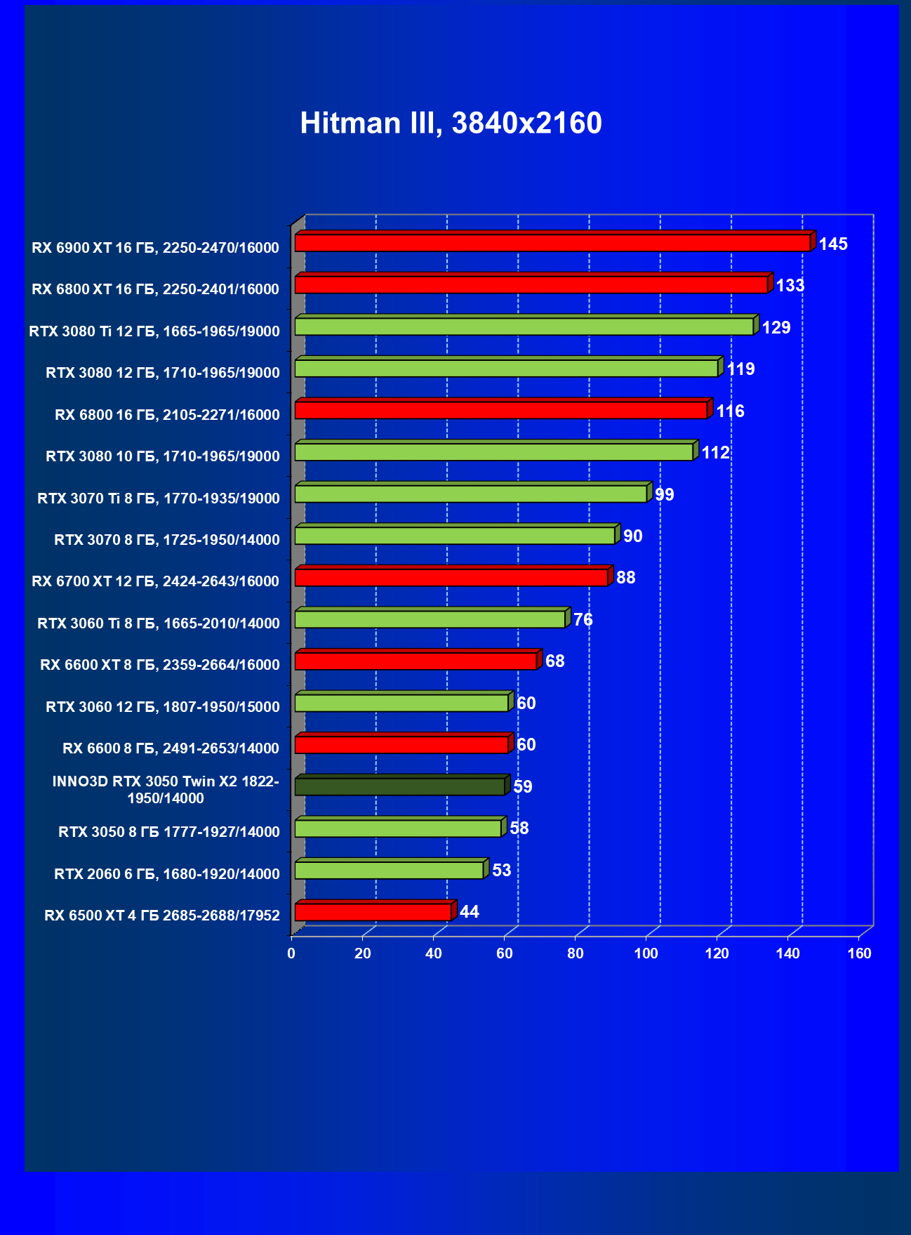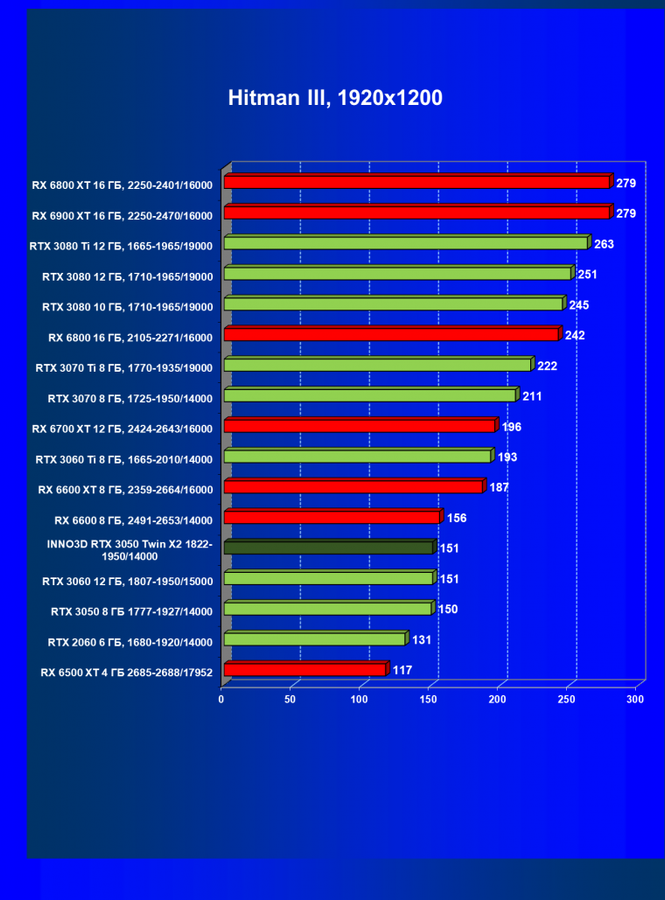 В свое время многочисленные тесты доказали, что GeForce RTX 3050 демонстрирует хорошую производительность во многих «классических» играх без использования трассировки лучей в разрешении Full HD при условии максимального качества графики, но все же в ряде игр FPS может быть низковат для 1920×1080, и тогда приходится снижать настройки качества графики. Ближайший конкурент из стана AMD — Radeon RX 6600, эта видеокарта немного шустрее и потянет уже все игры с растеризацией в Full HD без снижения настроек. Видеокарта Inno3D в плане производительности чуть быстрее референс-аналога.