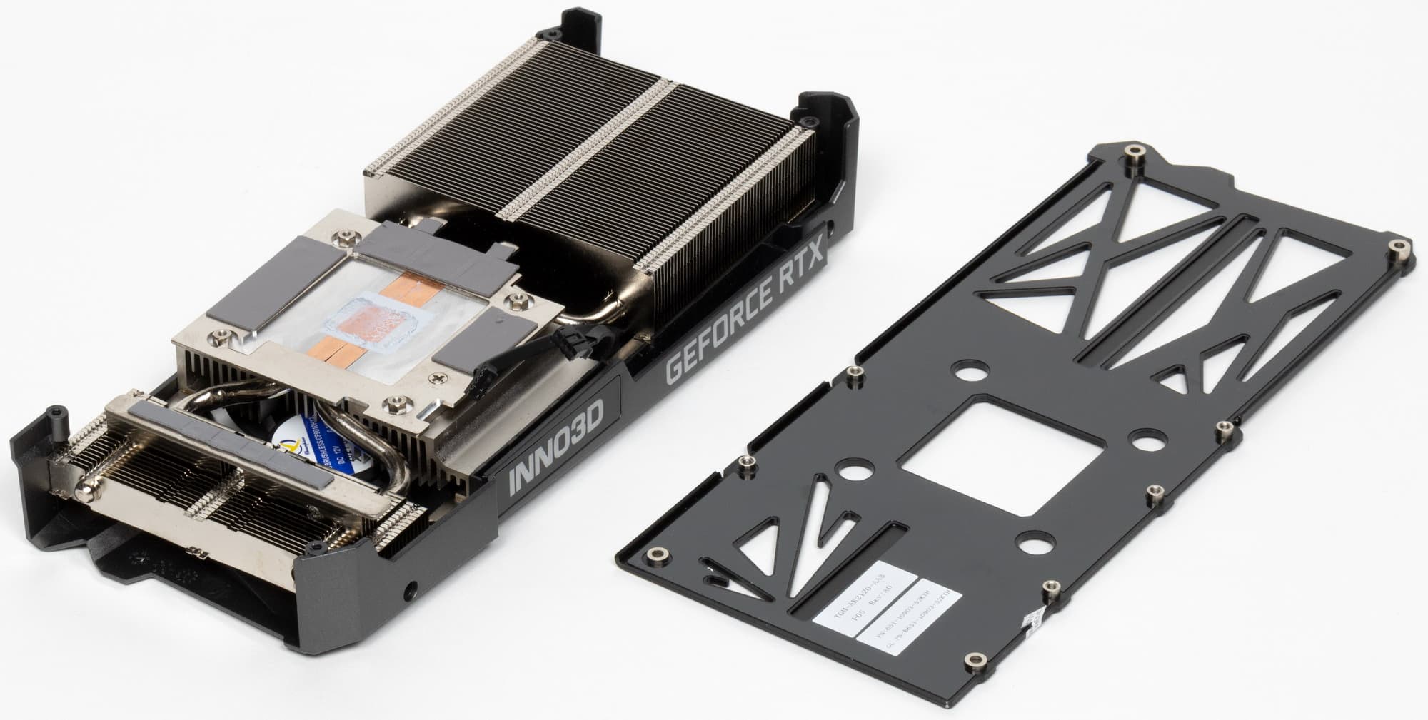 Основой системы охлаждения является двухсекционный пластинчатый радиатор с тепловыми трубками, к которым припаяна специальная платформа, которая охлаждает GPU (через прямой контакт с медными тепловыми трубками) и микросхемы памяти (через термопрокладки), а для охлаждения преобразователей питания VRM на радиаторе предусмотрена отдельная мини-подошва. Задняя пластина служит только элементом жесткости (и применяется для защиты PCB).