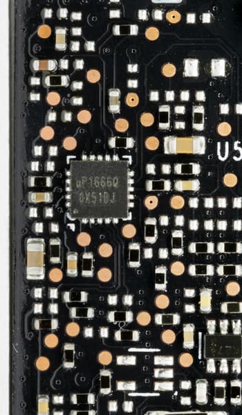 А контроллер uP1666Q (uPI Semiconductor) управляет одной фазой питания микросхем памяти. Оба контроллера расположены на обороте печатной платы.