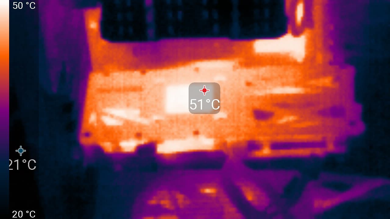 В режиме максимальной нагрузки в 3D температура достигала 63 °C. Вентиляторы при этом раскручивались до 1470 оборотов в минуту, шум вырастал до 26 дБА: это тихо.