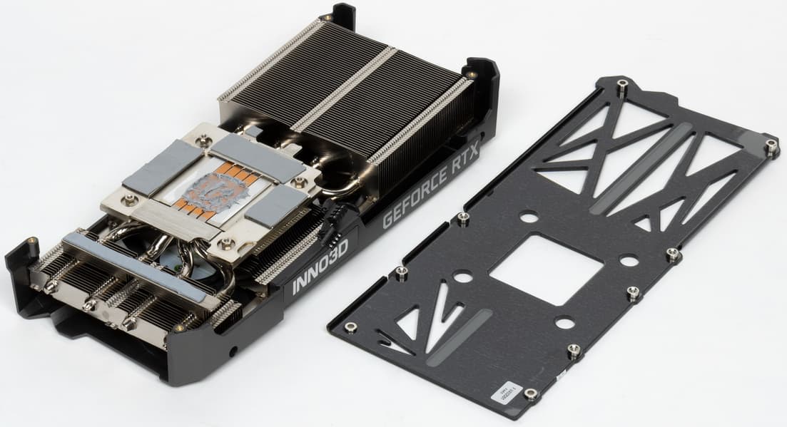 Основой системы охлаждения является пластинчатый никелированный радиатор с тепловыми трубками, впрессованными посреди большой подошвы, при этом трубки напрямую снимают тепло с GPU, а микросхемы памяти охлаждаются через термоинтерфейс. Для преобразователя питания VRM GPU имеется своя небольшая подошва на том же радиаторе.