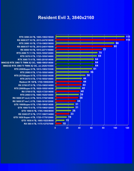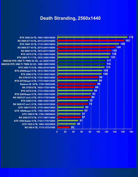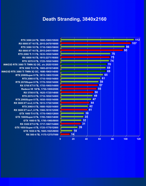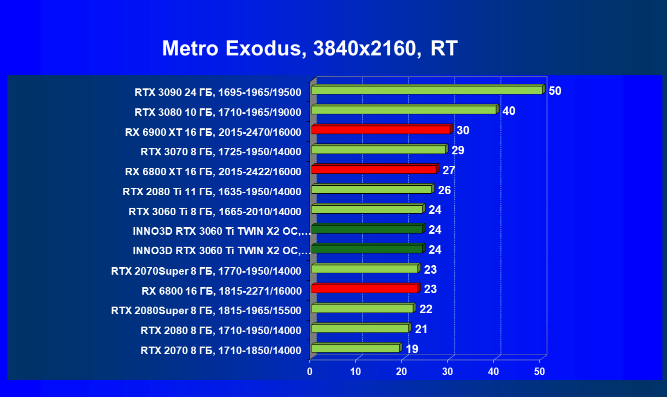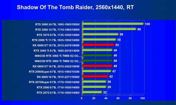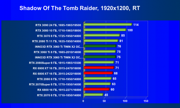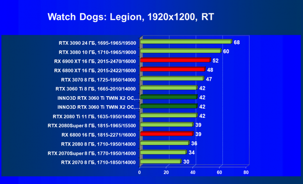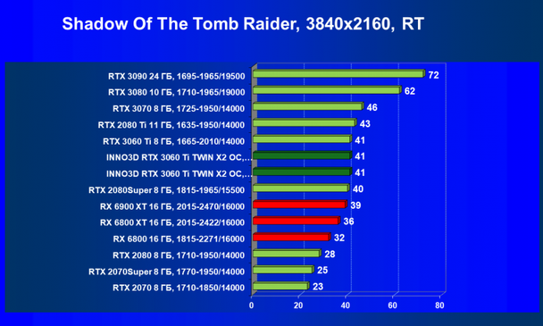 В целом соотношение сил осталось таким же, но Radeon RX 5700 XT не участвует в этом рейтинге из-за отсутствия поддержки RT, а у (наверное) более дорогого Radeon RX 6800 (сейчас все цены перемешаны) производительность в таких играх ниже, нежели у GeForce RTX 3060 Ti.