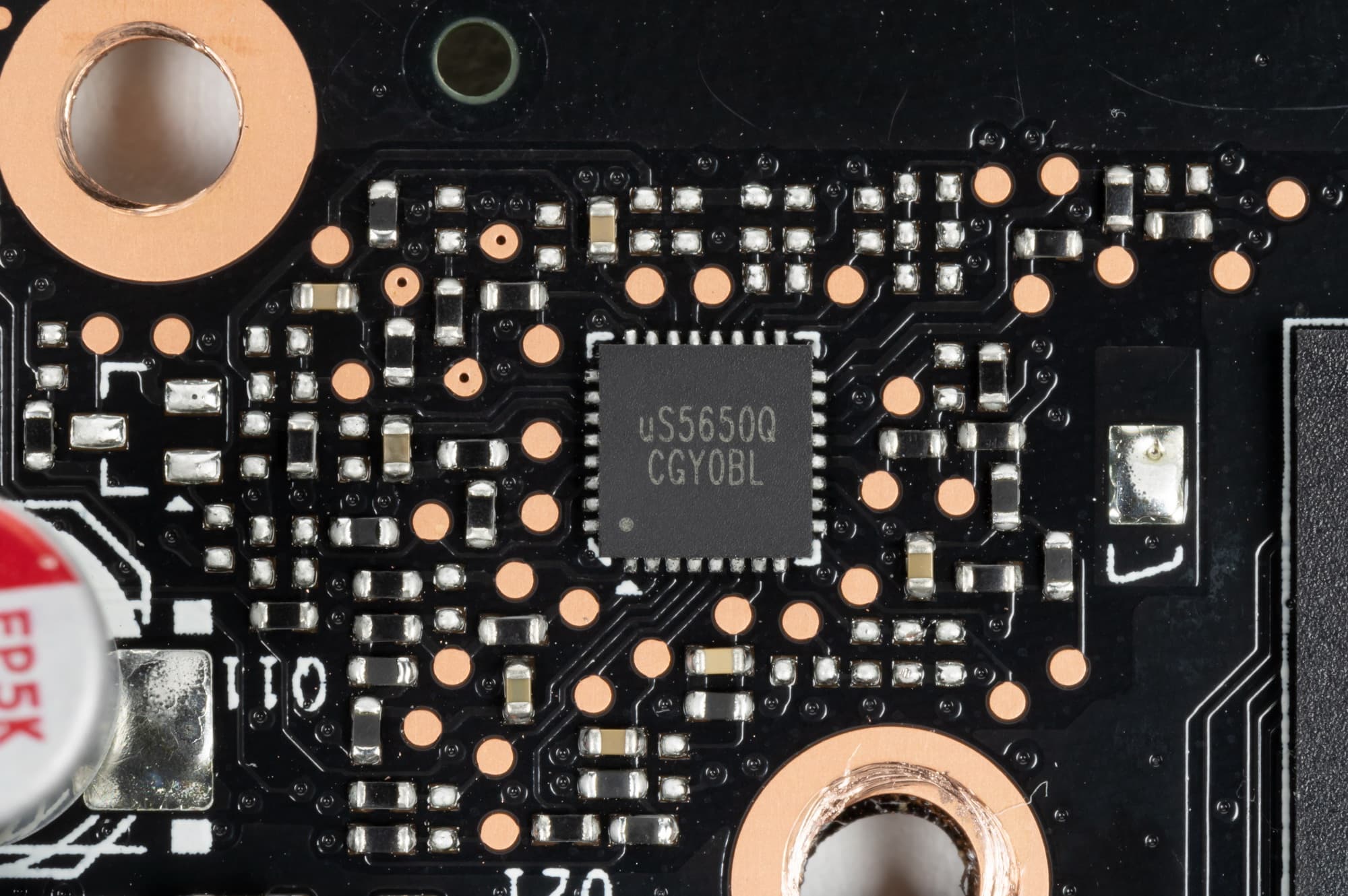 Также имеется контроллер uS5650Q (uPI Semiconductor), отвечающий за мониторинг карты (слежение за напряжением и температурой), расположенный на лицевой стороне PCB.