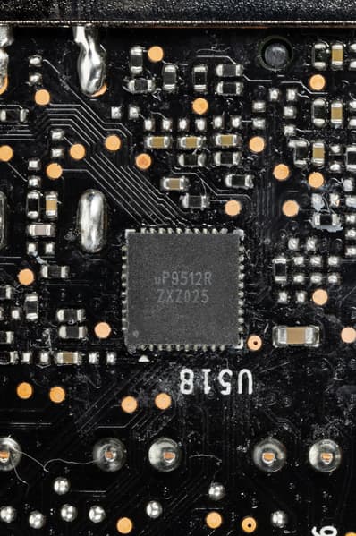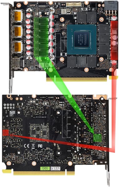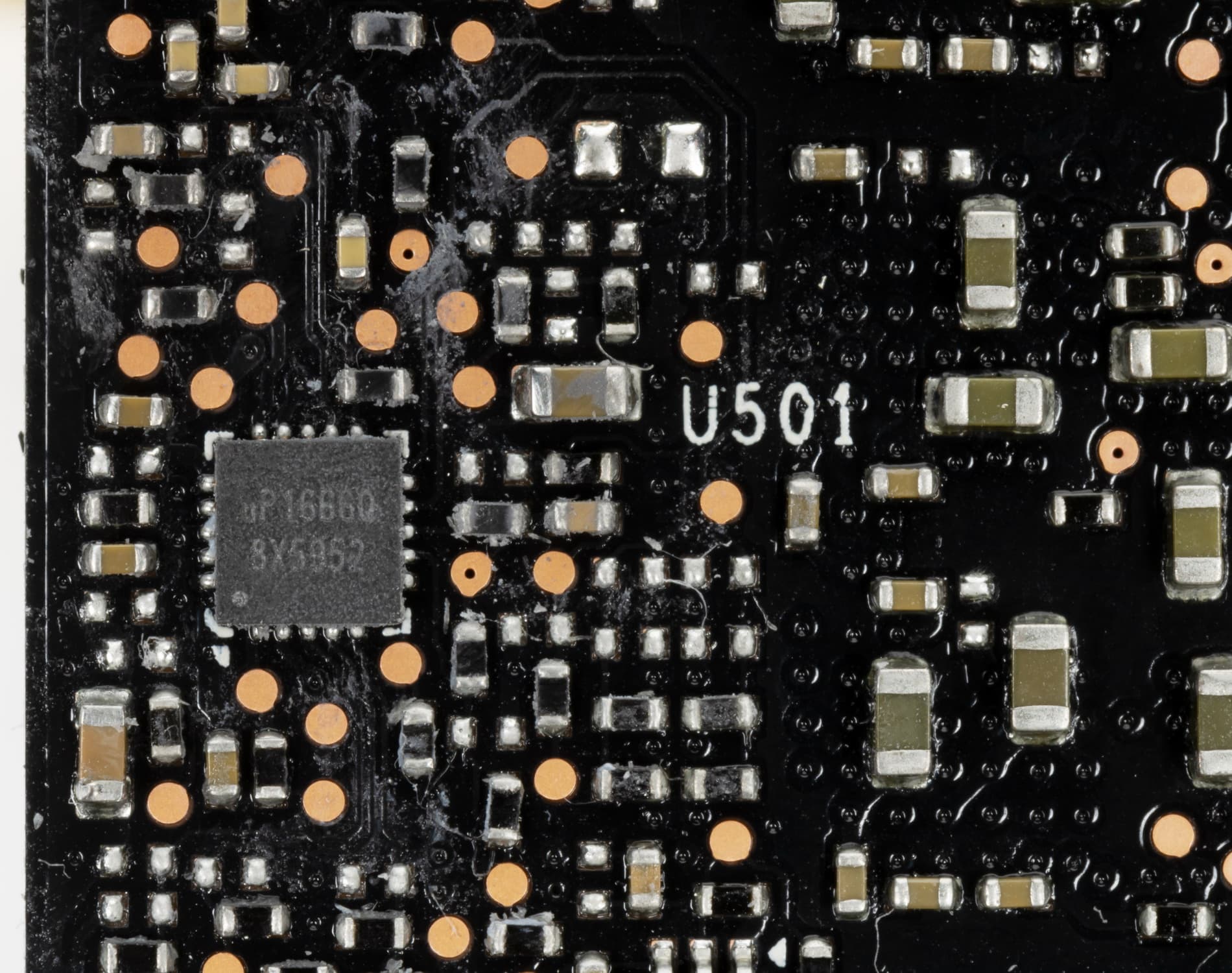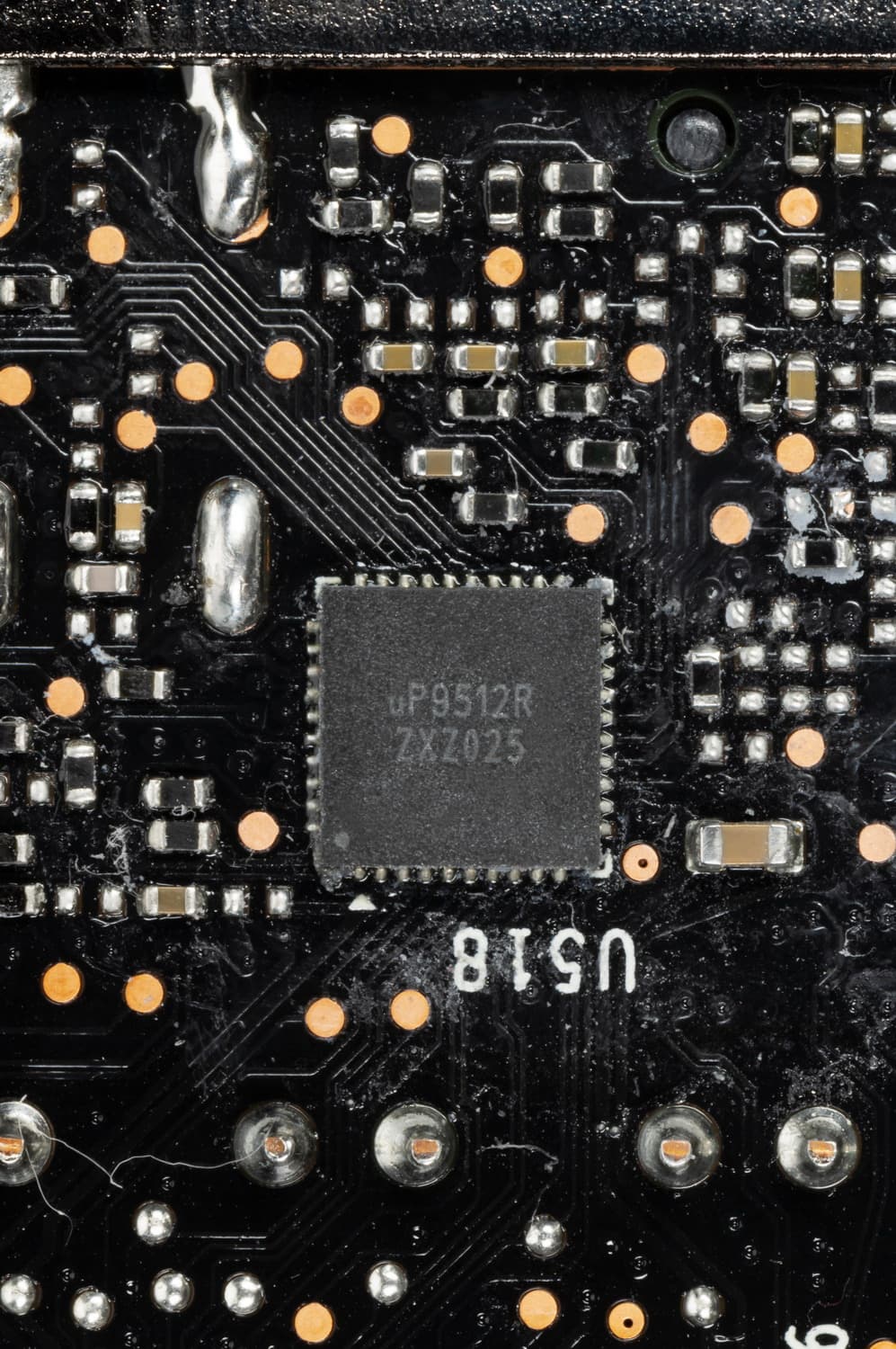 Зеленым цветом отмечена схема питания ядра, красным — памяти. Для управления схемой питания GPU используется ШИМ-контроллер uP9512R (uPI Semiconductor), способный управлять максимум 8 фазами и расположенный на оборотной стороне платы.