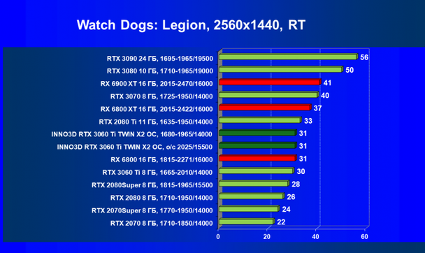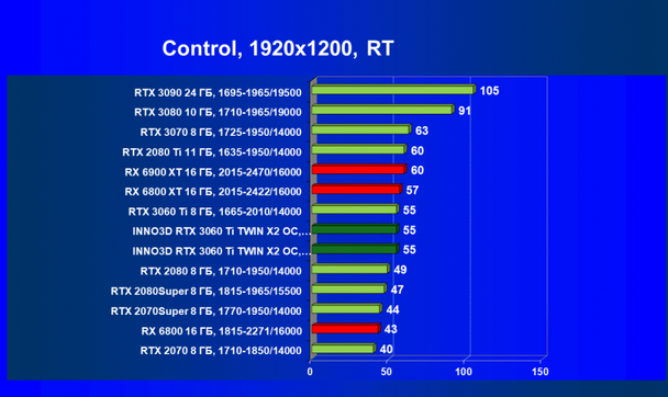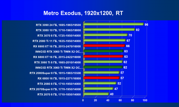 Со стороны AMD у GeForce RTX 3060 Ti конкурентов пока нет, новые топовые решения компании относятся к более высокому уровню. Однако как только мы включаем RT, производительность Radeon RX 6000 сильно проседает, и GeForce RTX 3060 Ti может легко обойти даже Radeon RX 6800.
