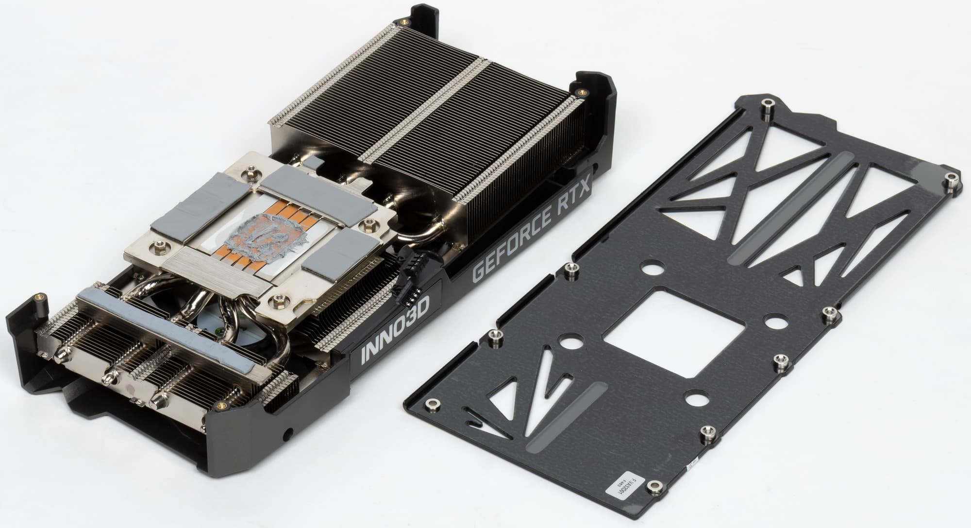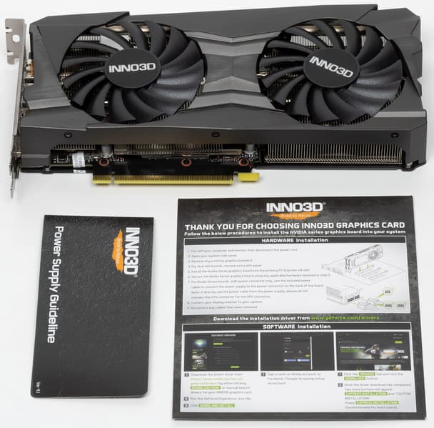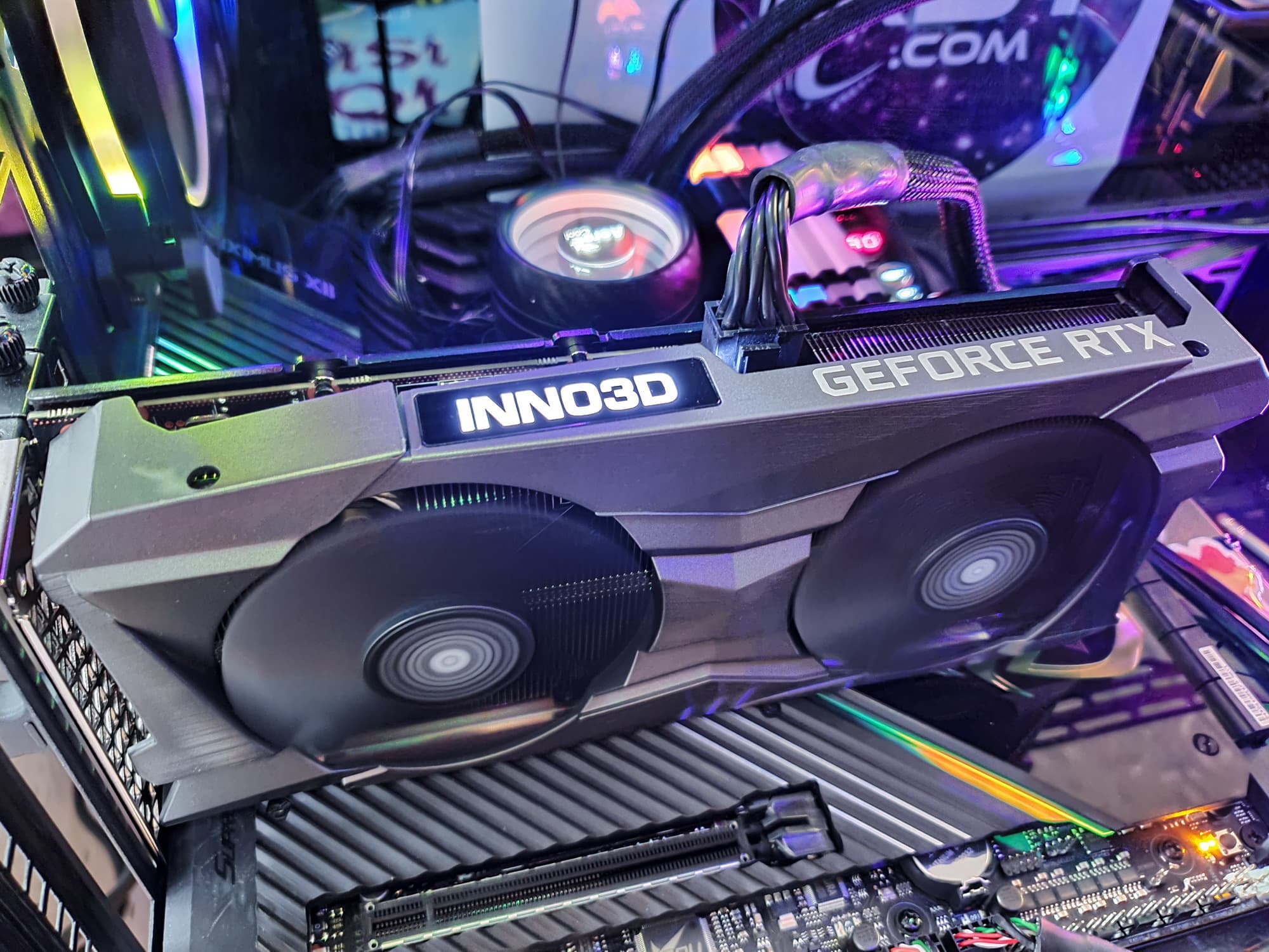 Штатные частоты памяти у карты Inno3D равны референсным значениям, Boost-частота работы ядра примерно равна референс-аналогу (1680 против 1665 МГц), так что в среднем разница в производительности с референсной картой составляет меньше 1%, а максимальное значение частоты работы ядра оказалось даже ниже, чем у референса. Максимальное потребление карты Inno3D — 207 Вт. Разумеется, был испробован ручной разгон, однако ограничение потребления можно было поднять всего на 6%, удалось достичь стабильной работы при увеличении частоты ядра всего на 100 МГц, а памяти — на 775 МГц, с максимумом по частотам 1715—2025/15500 МГц. Это обеспечило прирост производительности в среднем всего на 1,5%. При этом и максимум энергопотребления практически не вырос: 210 Вт.