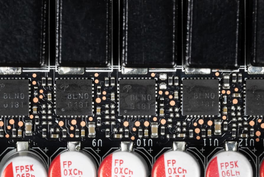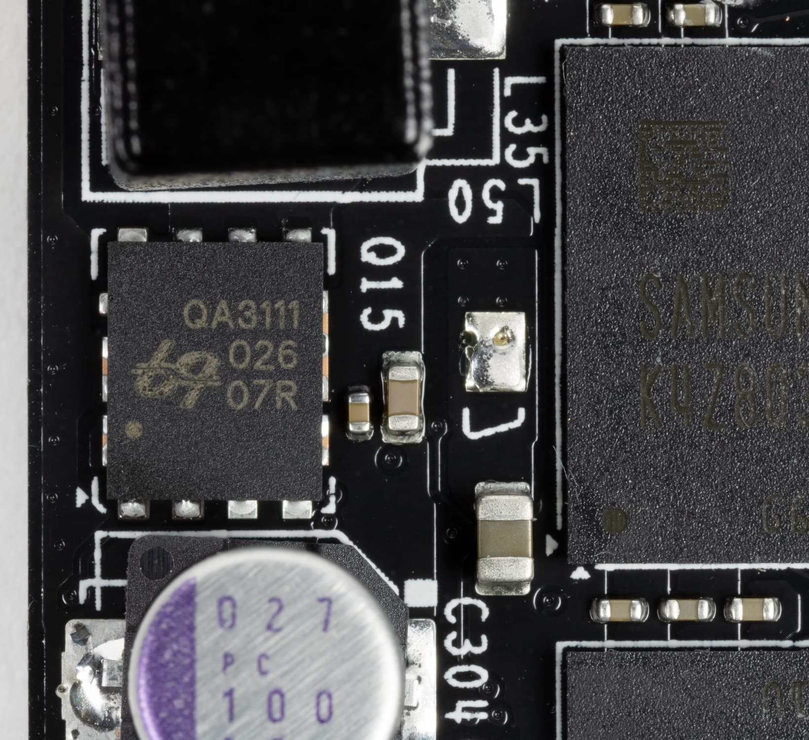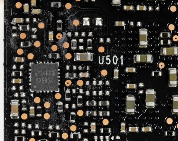 В преобразователе питания, традиционно для всех видеокарт Nvidia, используются транзисторные сборки DrMOS — в данном случае для GPU применяются AOZ5332QI (Alpha & Omega Semiconductor), каждая из которых рассчитана максимум на 50 А.