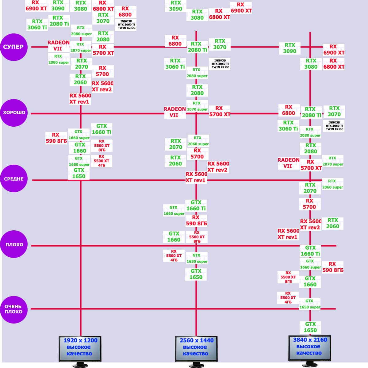 В начале всех обзоров серийных видеокарт мы обновляем свои знания о производительности семейства, к которому относится ускоритель, и его соперников. Все это нами субъективно оценивается по шкале из пяти градаций. Этот обзор был сдан до выхода Radeon RX 6700 XT, поэтому последний не представлен на сводных диаграммах.