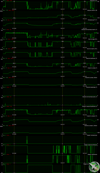 Остановка вентиляторов при малой нагрузке видеокарты происходит, если выполняются одновременно два условия: температура GPU опускается ниже 40 градусов, а потребление падает ниже 26 Вт. При запуске ПК вентиляторы работают, но затем еще до загрузки ОС выключаются (из-за лимита TGP в 26 Вт остановки вентиляторов иногда приходится ждать долго). Ниже есть видеоролик на эту тему (я не смог дождаться остановки вентиляторов при записи, это случилось только через 10 минут). Стартуют же вентиляторы при нагреве GPU выше 59 градусов или при TGP выше 50 Вт.