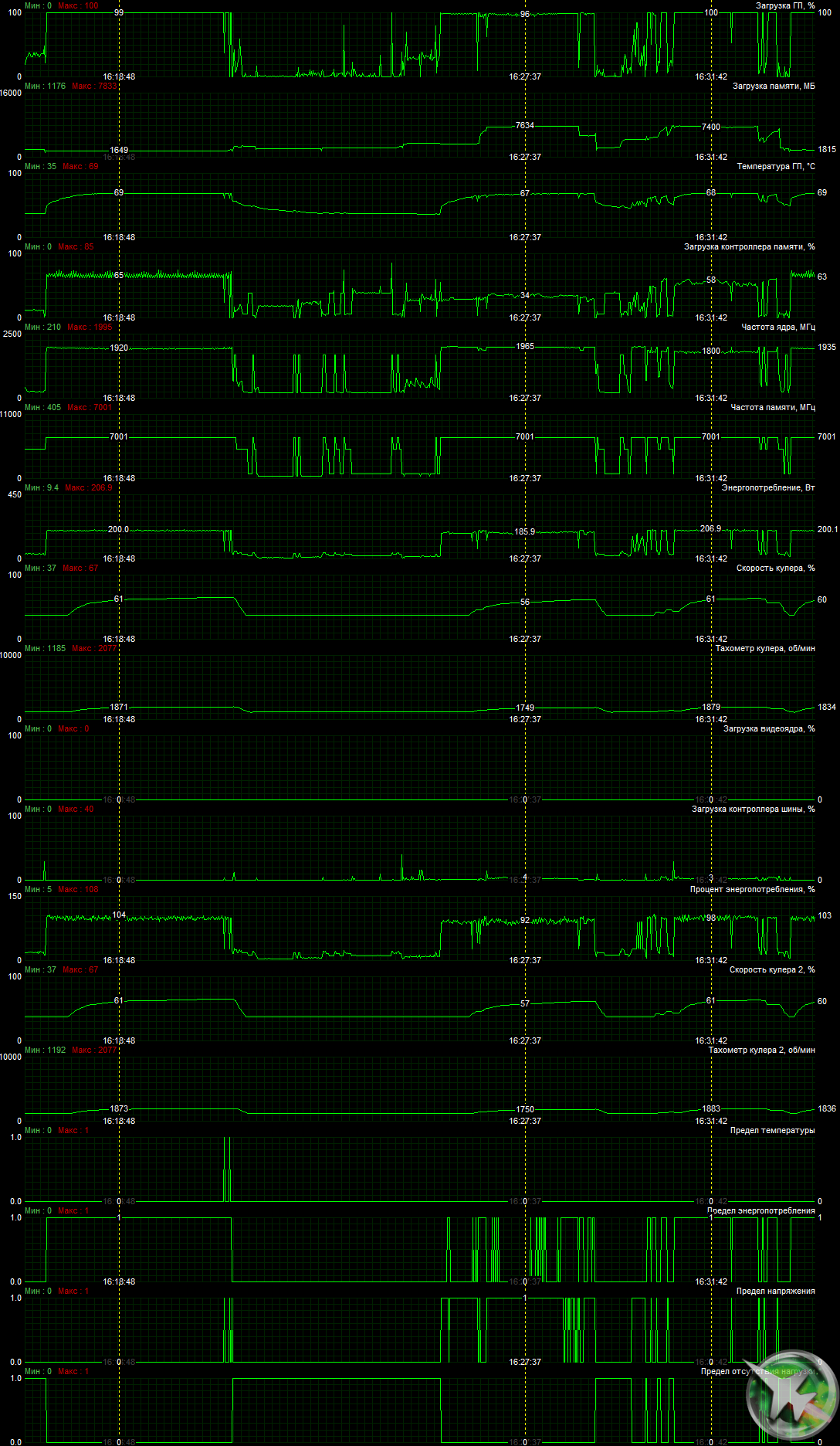 После 2-часового прогона под нагрузкой максимальная температура ядра не превысила 69 градусов, что является нормальным результатом. Энергопотребление карты доходило до 207 Вт.