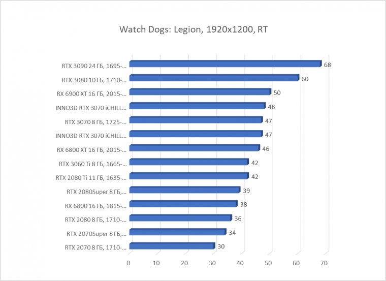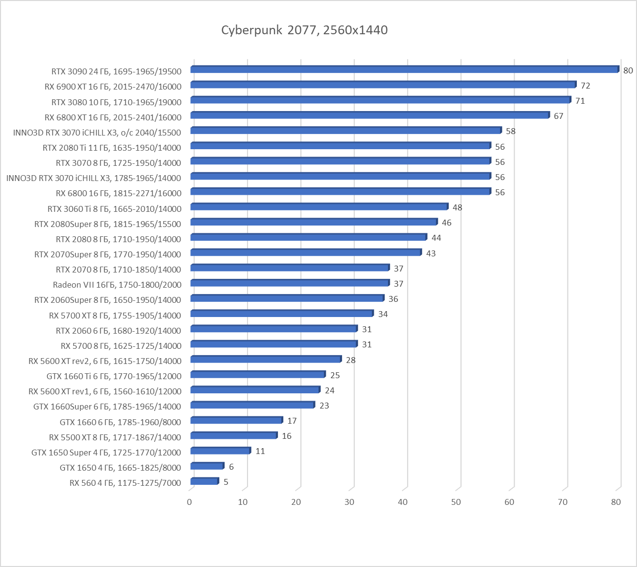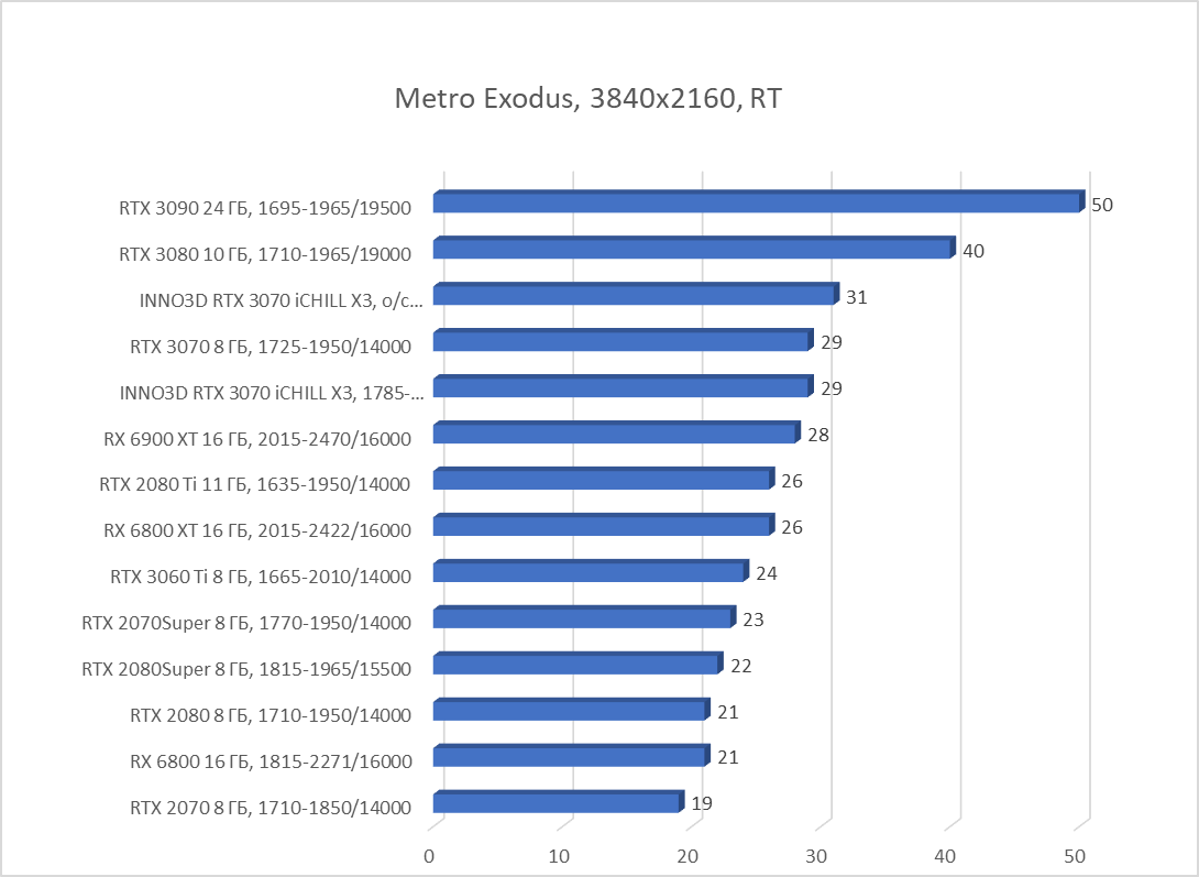 Наши тесты показали небольшое преимущество Radeon RX 6800 над GeForce RTX 3070 в играх с чистой растеризацией. И даже небольшой разгон карты Inno3D не позволил ей догнать Radeon RX 6800.