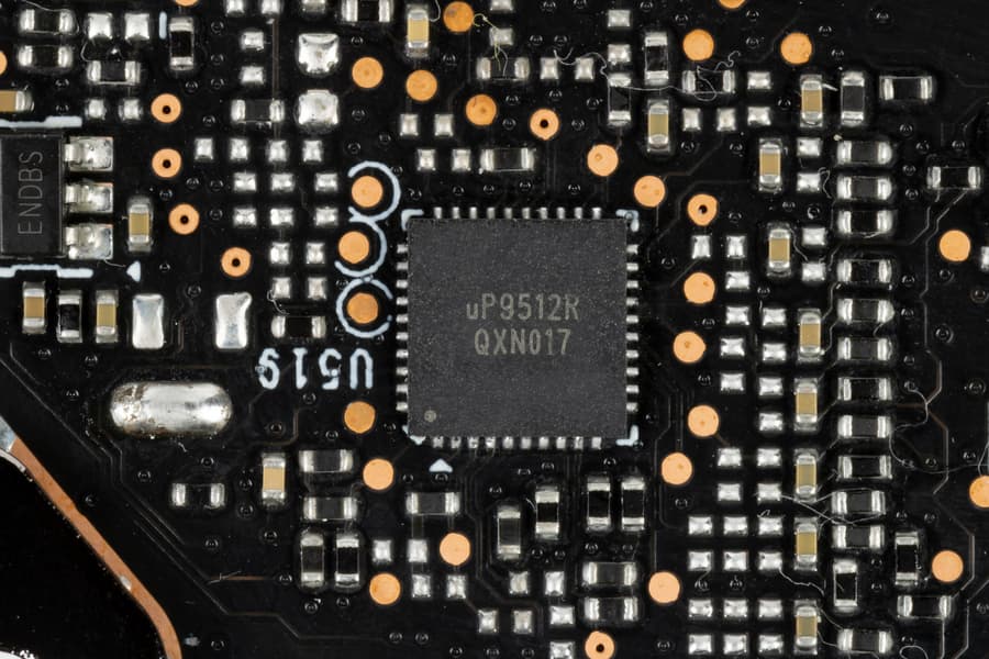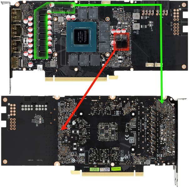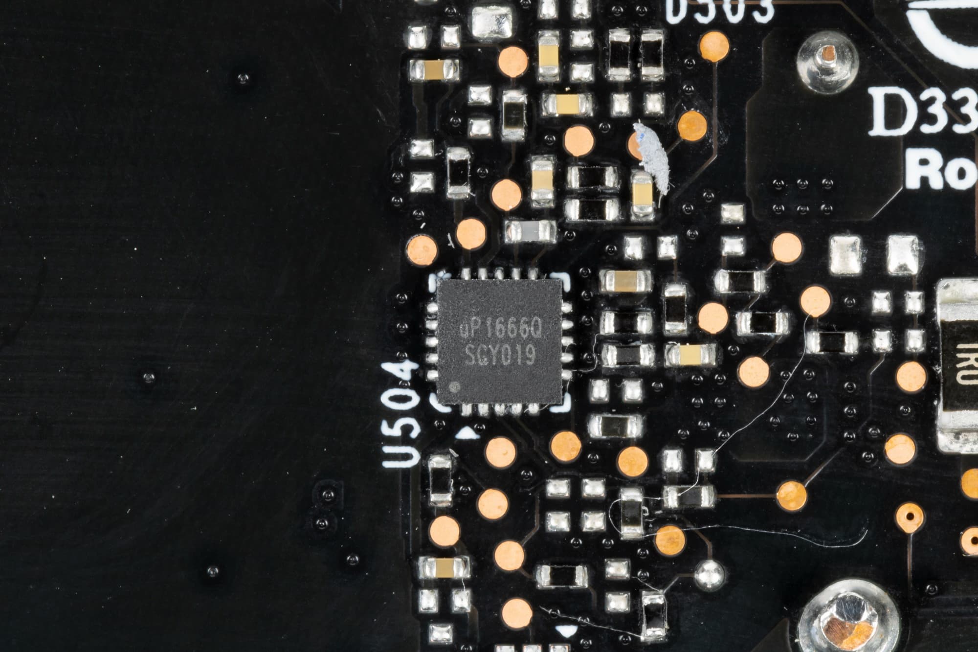Зеленым цветом отмечена схема питания ядра, красным — памяти. Для управления схемой питания GPU используется ШИМ-контроллер uP9512R (uPI Semiconductor), он расположен на оборотной стороне платы.