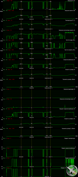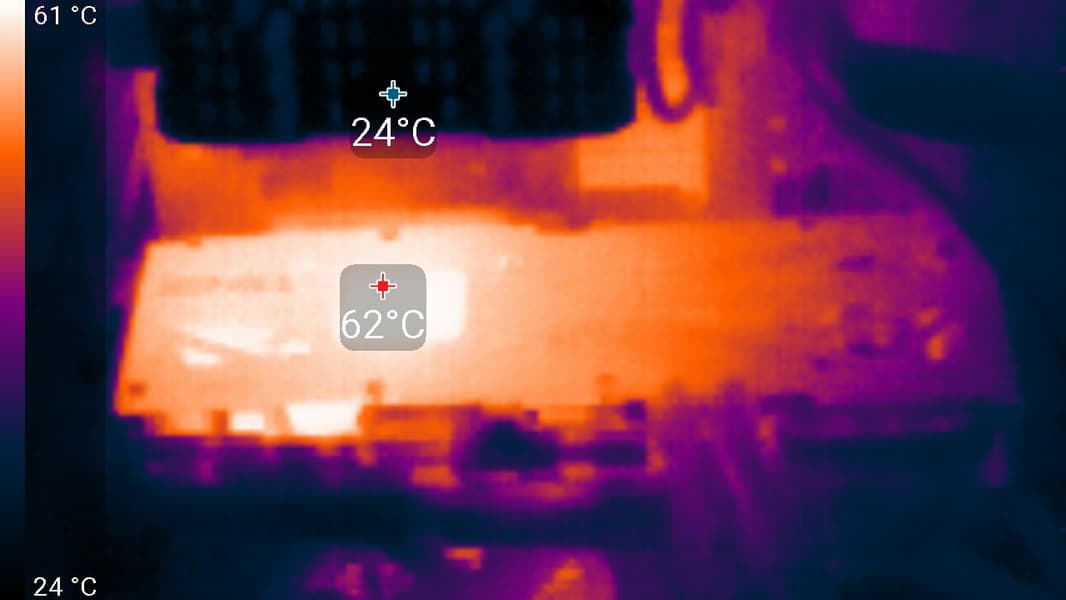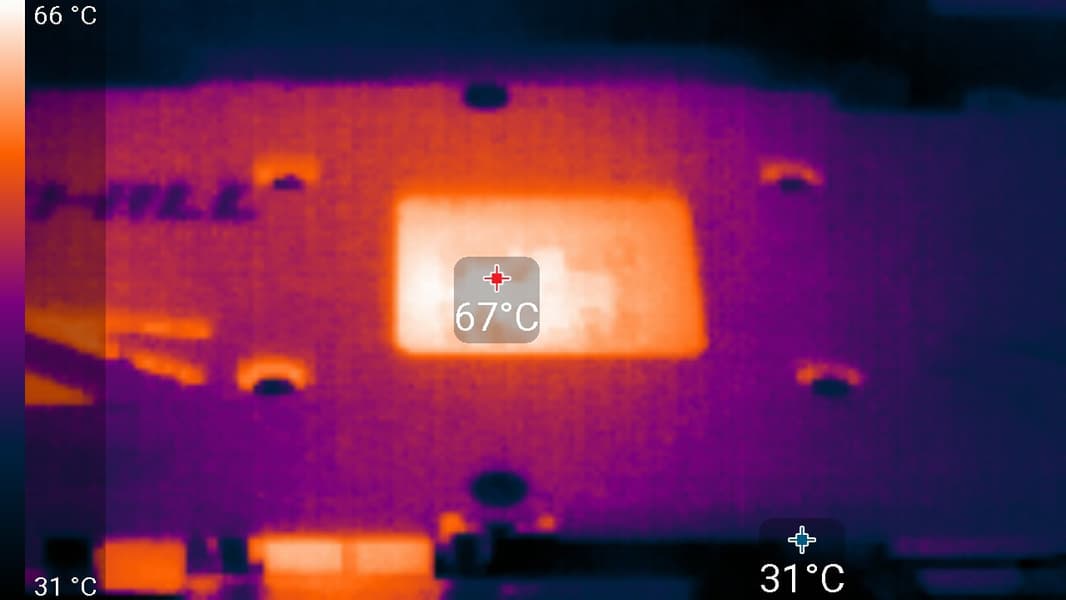 После 6-часового прогона под нагрузкой максимальная температура ядра не превысила 70 градусов, что является нормальным результатом для видеокарт топового уровня. Максимальная мощность была зафиксирована на уровне 245 Вт, а максимальный нагрев наблюдался в центральной части PCB, в основном около ядра (и основным источником нагрева является память).