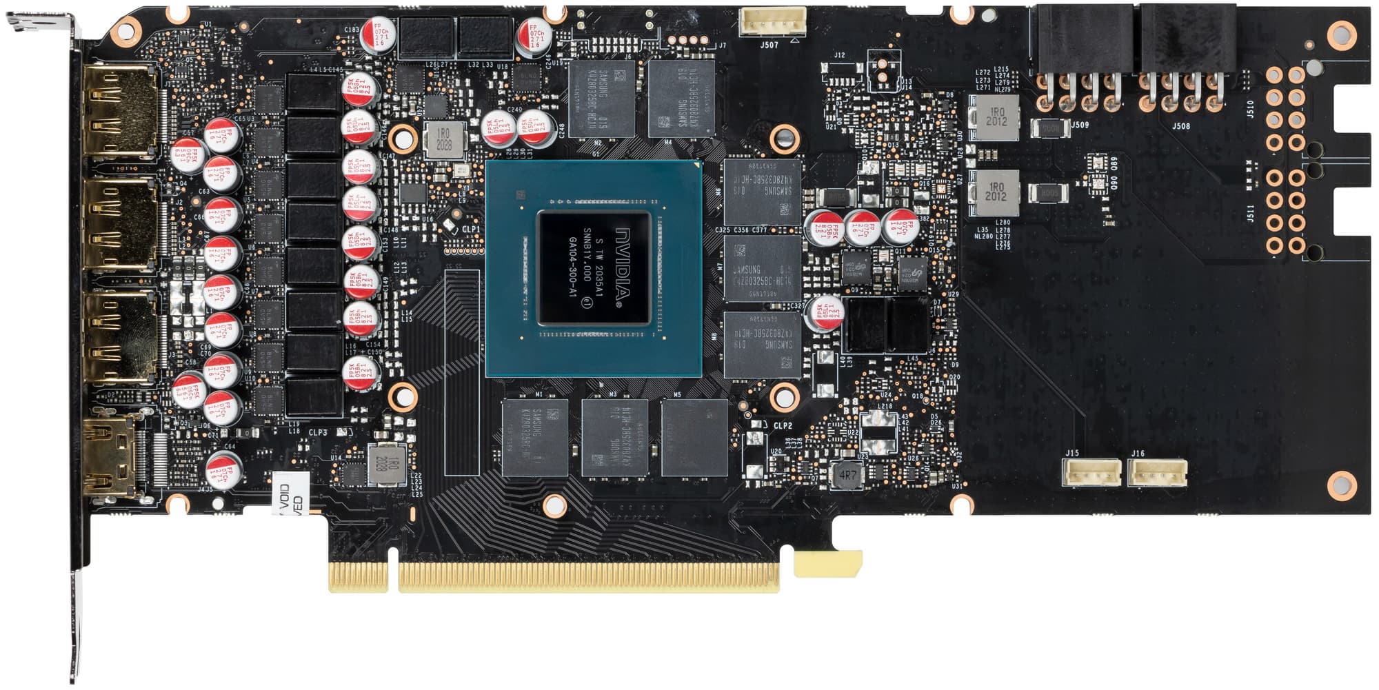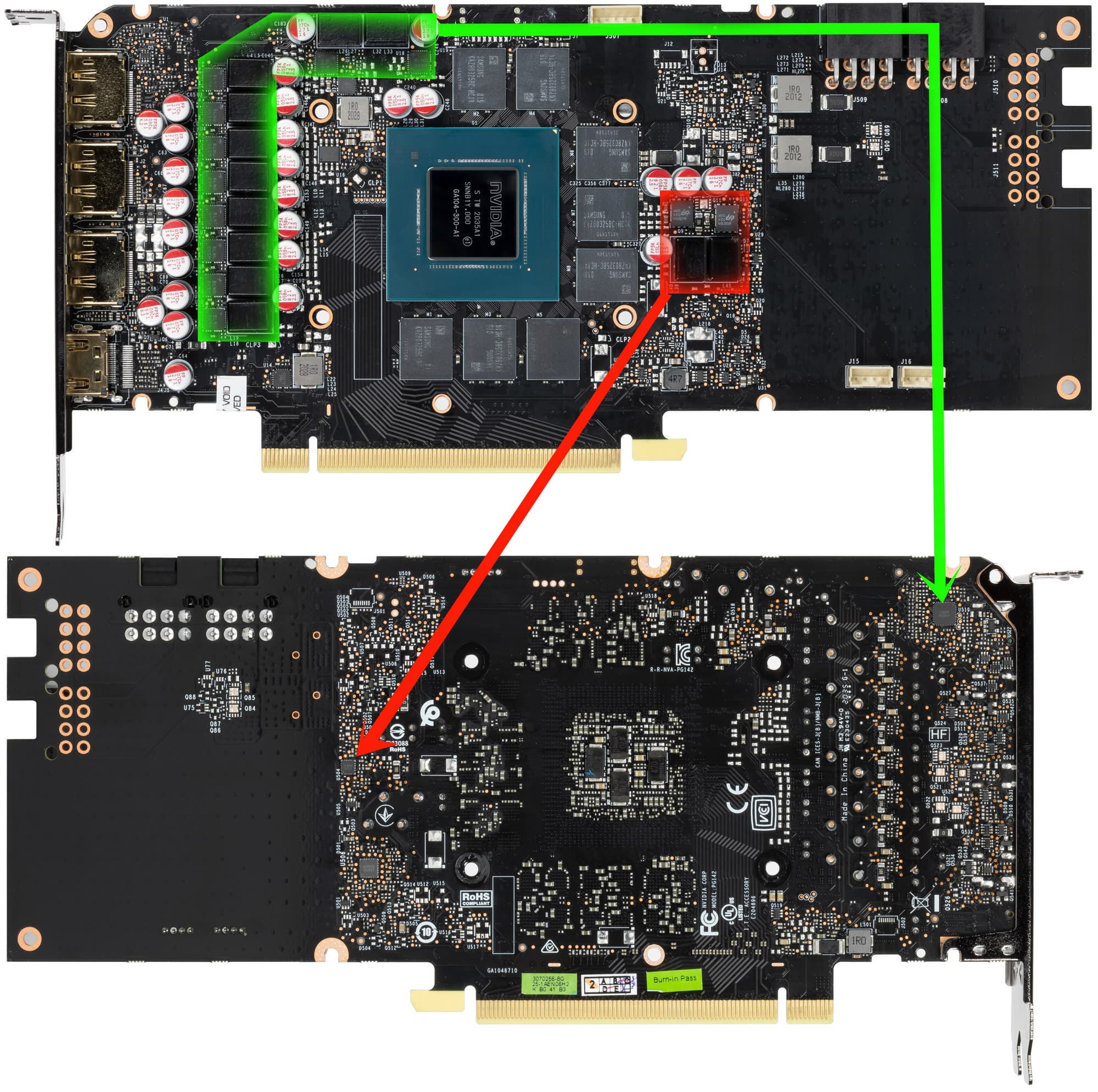 Собственно, мы видим СО, перекочевавшую на 3070 от более старших собратьев, потому она и такая огромная. И нет удивления, почему такая немного несуразная PCB с пустой хвостовой частью: а попробуйте насадить такой колоссальный радиатор на «пирпинденчик» типа печатной платы у референс-карты.