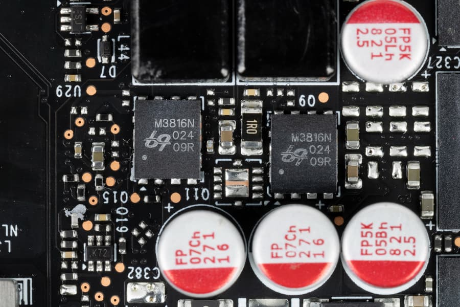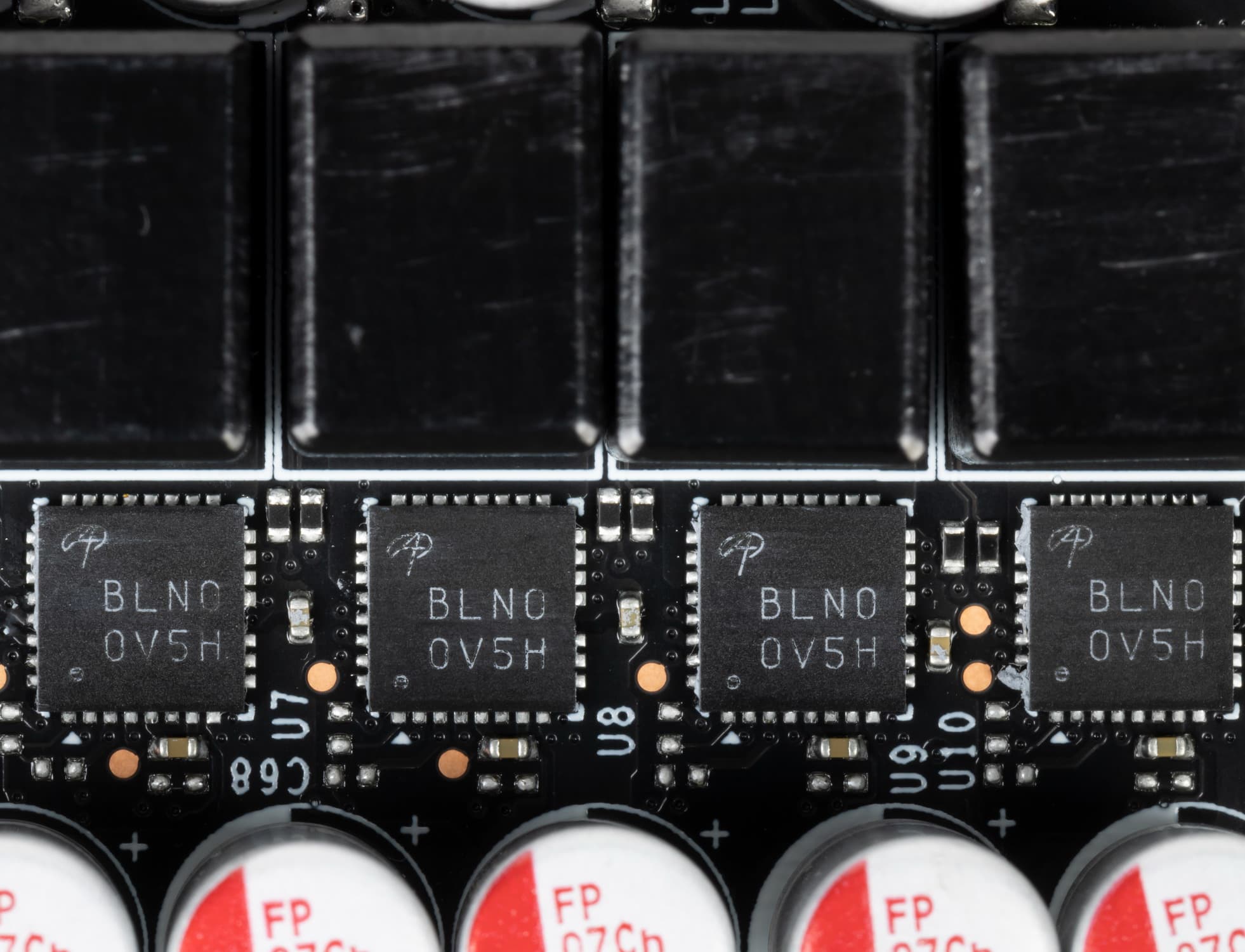 В преобразователе питания, традиционно для всех видеокарт Nvidia, используются транзисторные сборки DrMOS — в данном случае в цепях питания ядра — AOZ5311NQI (Alpha & Omega Semiconductor), каждая из которых рассчитана максимально на 50 А.