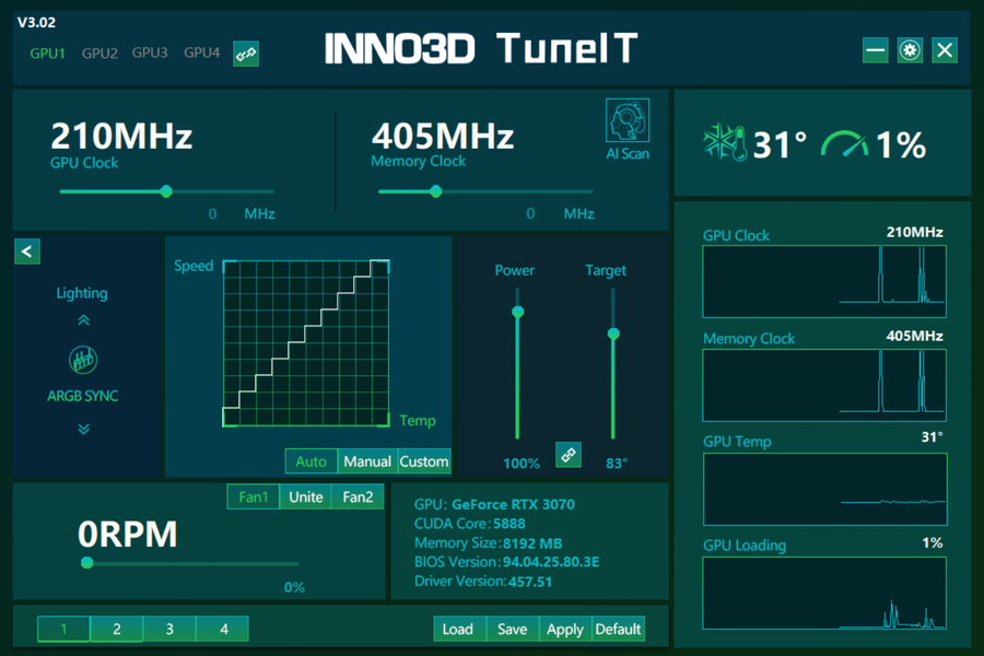 Управление работой карты обеспечивается с помощью собственной фирменной утилиты Inno3D TuneIt. В целом интерфейс прост и понимается интуитивно.