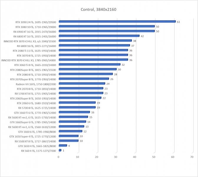 Рейтинг составлен по всем тестам без использования технологий трассировки лучей. Этот рейтинг нормирован по самому слабому ускорителю — Radeon RX 560 (то есть сочетание скорости и функций Radeon RX 560 приняты за 100%). В данном случае из общего списка выбрана группа карт для анализа, в которую входят GeForce RTX 3070 и его конкуренты.