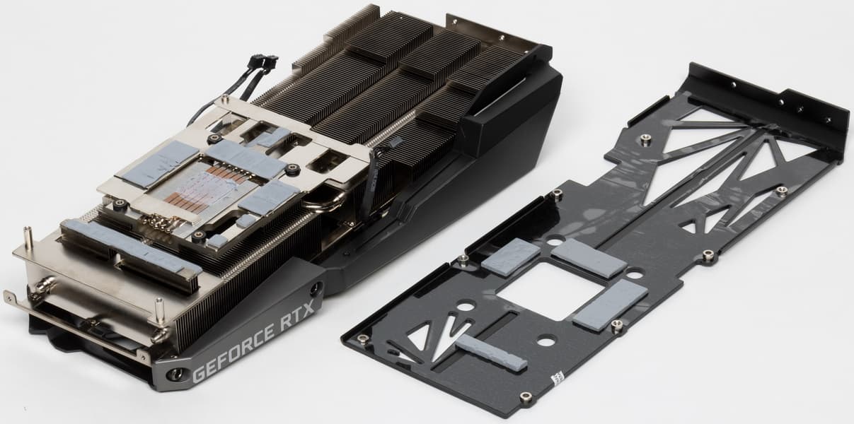 Перед нами большой пластинчатый никелированный радиатор с тепловыми трубками, формирующими подошву прямого контакта с GPU. Микросхемы памяти охлаждаются пластиной вокруг основной подошвы радиатора, а преобразователи питания VRM охлаждаются с помощью отдельных пластин, прикрученных к тому же радиатору. Задняя пластина не только служит элементом защиты PCB, но и участвует в охлаждении оборотной стороны платы через термоинтерфейс.