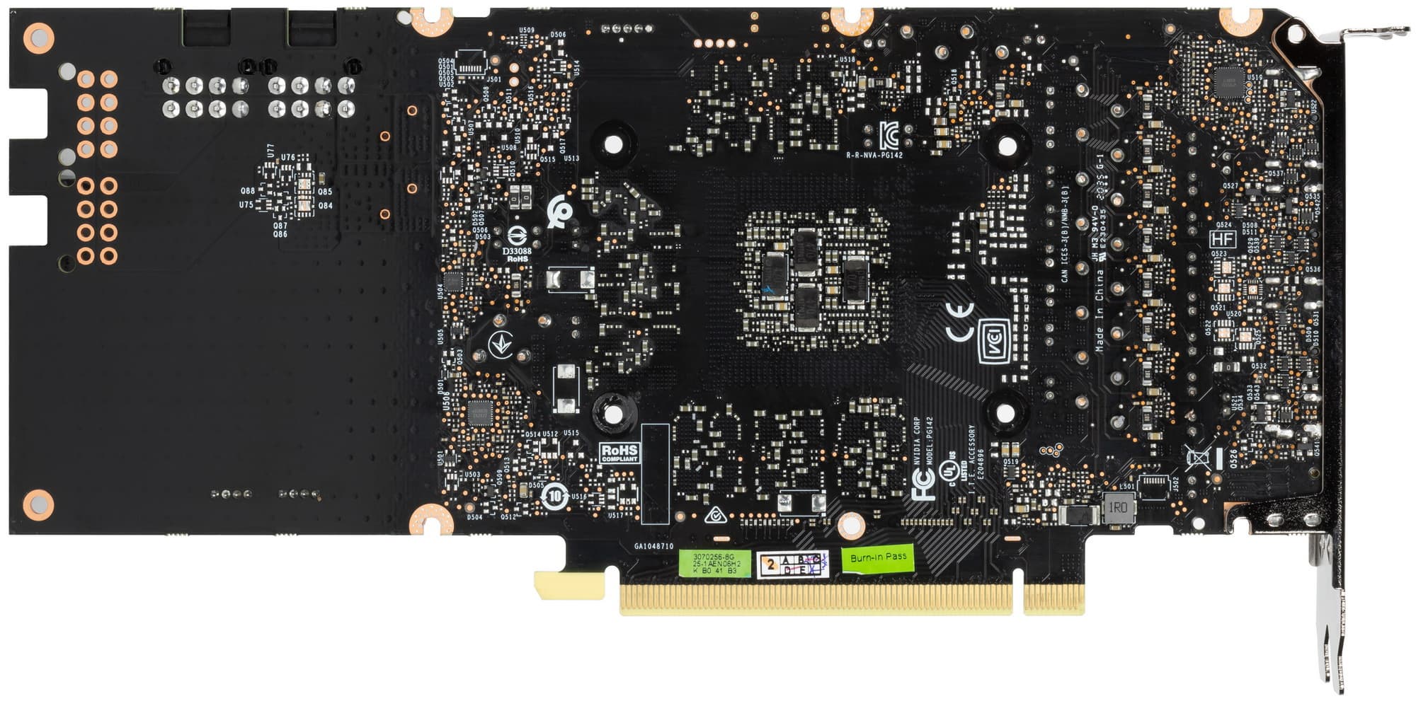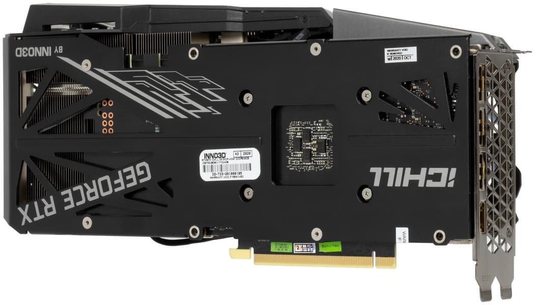 Напомним, что в Nvidia сделали два варианта дизайна PCB: для своих карт Founders Edition и для партнеров. Обе рассчитаны на способ охлаждения, предложенный также Nvidia: радиатор СО — сильно длиннее самой PCB, он выходит за пределы печатной платы, и самый крайний правый вентилятор СО продувает ребра и тепловые трубки радиатора насквозь, вынося тепло позади видеокарты. При этом левый вентилятор (или пара вентиляторов) продувают радиатор обычным путем, и горячий воздух поступает на верх (в корпус) и в низ видеокарты (на матплату). У карты Inno3D получилось очень забавно: PCB вроде и не короткая, однако обилие пустого места в хвостовой части говорит о том, что последняя нужна исключительно для крепления коннекторов питания, а также кулера к самой плате. В принципе, можно было вполне сделать отверстие в печатной плате для продува ее насквозь. Но при этом СО имеет намного более громоздкие габариты, и сквозной продув все равно есть позади даже такой относительно длинной PCB.