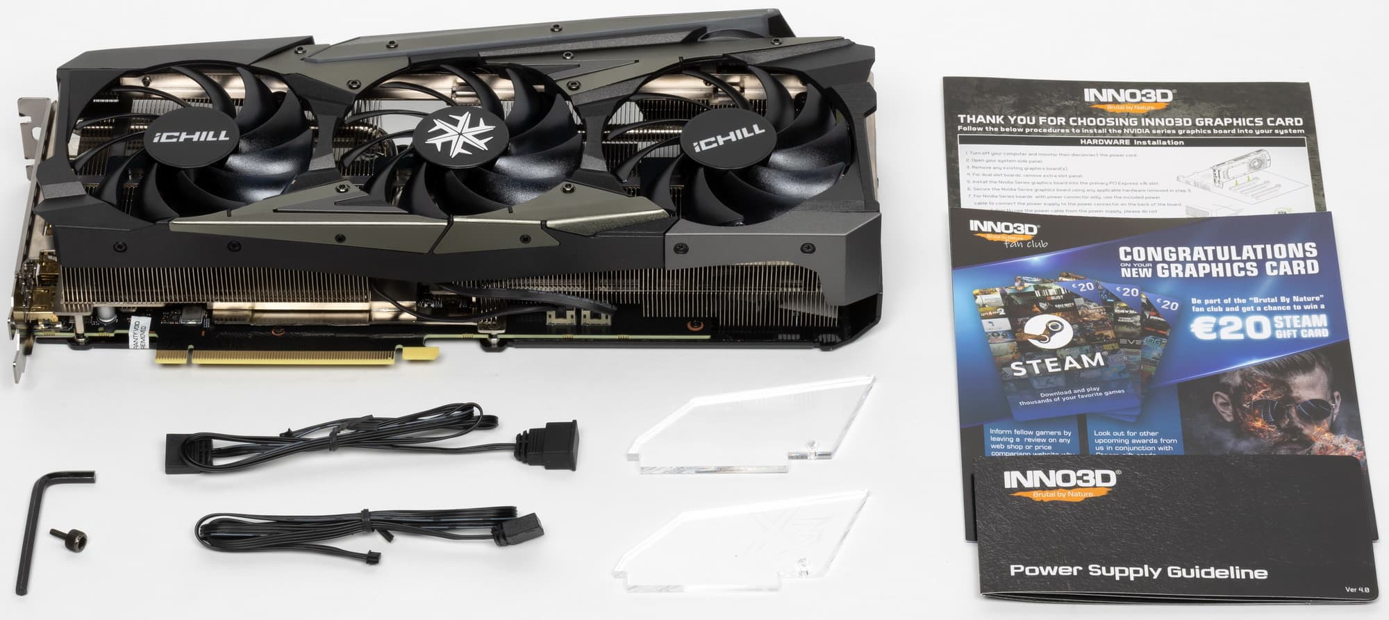 Комплект поставки, кроме традиционного руководства пользователя, включает акриловые вставки (одна с лого «Х3», а вторая пустая) для монтажа на карту, ключ для демонтажа вентиляторов без снятия СО с карты (он же используется и для монтажа акриловых вставок), а также провода для подключения подсветки карты к материнской плате.