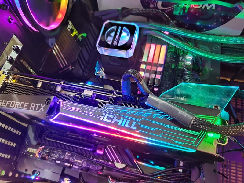 Выбор режимов скромный, однако этот вариант решения Inno3D предлагает возможность подключить подсветку (с помощью комплектных проводов) к соответствующим разъемам ARGB/RGB на материнской плате, поэтому можно синхронизировать работу подсветки. Видеоролик ниже демонстрирует подключение на основе карты Inno3D GeForce RTX 3080 iChill X4, в данном случае все то же самое.