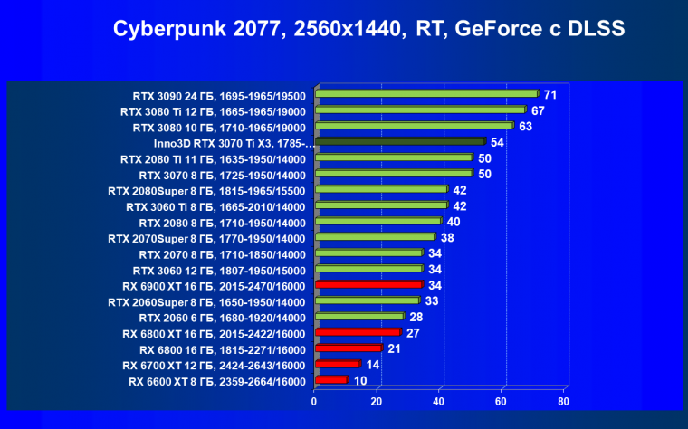 Наши тесты показали, что GeForce RTX 3070 Ti отлично подходит в «классических» играх без использования трассировки лучей в разрешении 4К при условии максимального качества графики, то же самое справедливо и для игр с использованием трассировки лучей при задействовании умного антиалиасинга DLSS, а остальные игры с RT (но без DLSS) будут играбельны в 2.5K при максимальном качестве графики. Ближайший конкурент — Radeon RX 6800. Видеокарта Inno3D в этом плане почти полностью аналогична референс-карте (условный фабричный разгон мало чего дает в реальности).