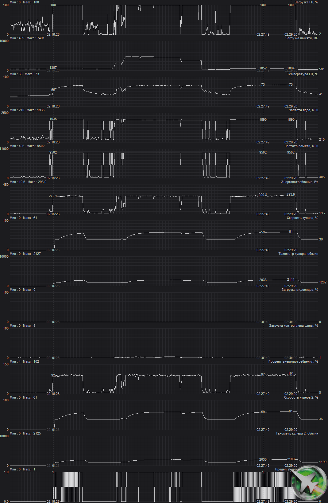 После 2-часового прогона под нагрузкой максимальная температура не превысила 73 градусов по ядру и 84 градусов на микросхемах памяти, что нормально для карт такого уровня. Энергопотребление карты доходило до 293 Вт. Напомним, что безопасный предел нагрева памяти GDDR6X — 105 °C.