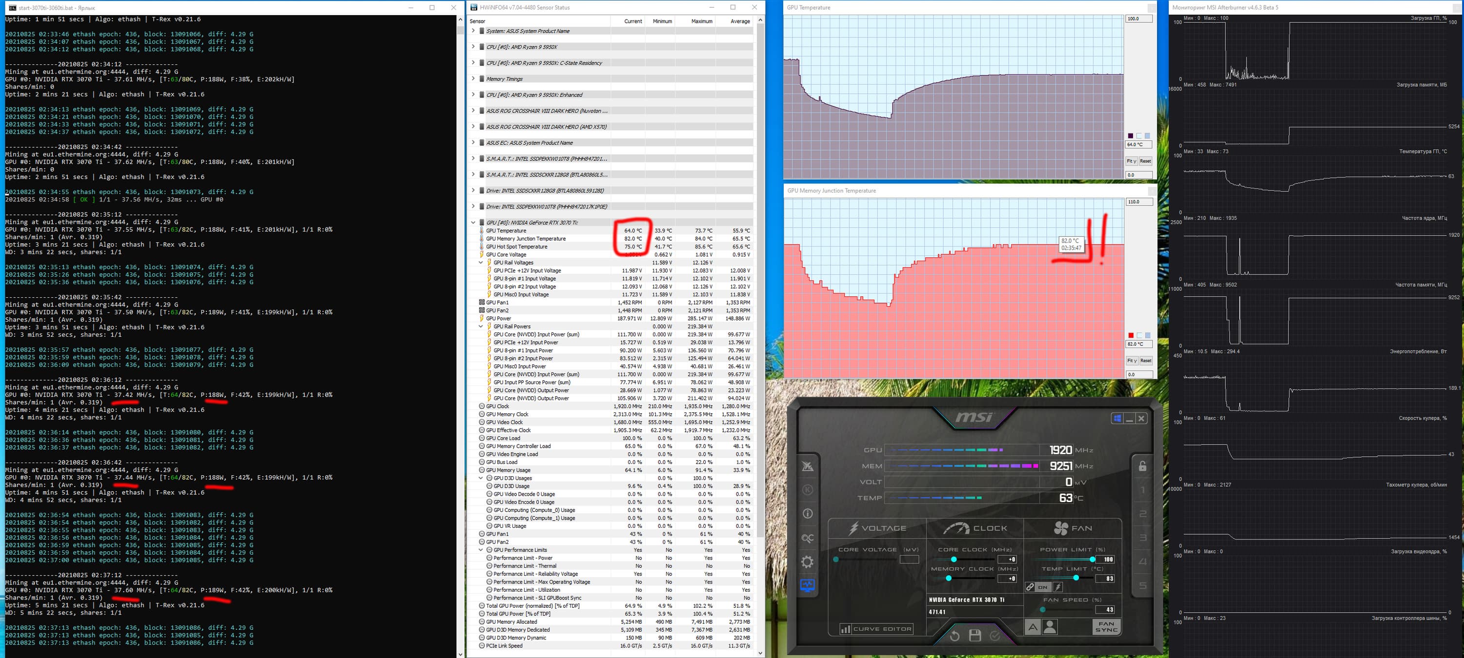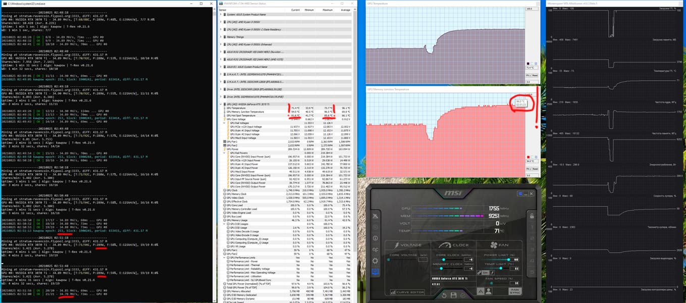 Оптимизация настроек работы видеокарт под майнинг в нашем случае не предусматривает сильного разгона видеопамяти, также обязательным является внешний обдув видеокарт. Особо тщательно надо следить за нагревом GDDR6X у GeForce RTX 3070Ti/3080/3080Ti/3090, ибо максимум для этой памяти — 110 градусов, и она долго не проживет, постоянно работая в условиях нагрева выше 100 °C. В нашем случае после оптимизации параметров работы карты и принудительного улучшения охлаждения нагрев памяти в майнинге по алгоритму ethash резко снизился до 68-70 градусов, так что в плане температурных показателей карта вполне годна для таких целей. Но все же не забываем, что выдает она низкий хэшрейт — около 41 МХ/с, потребляя при этом весьма много — 141 Вт.