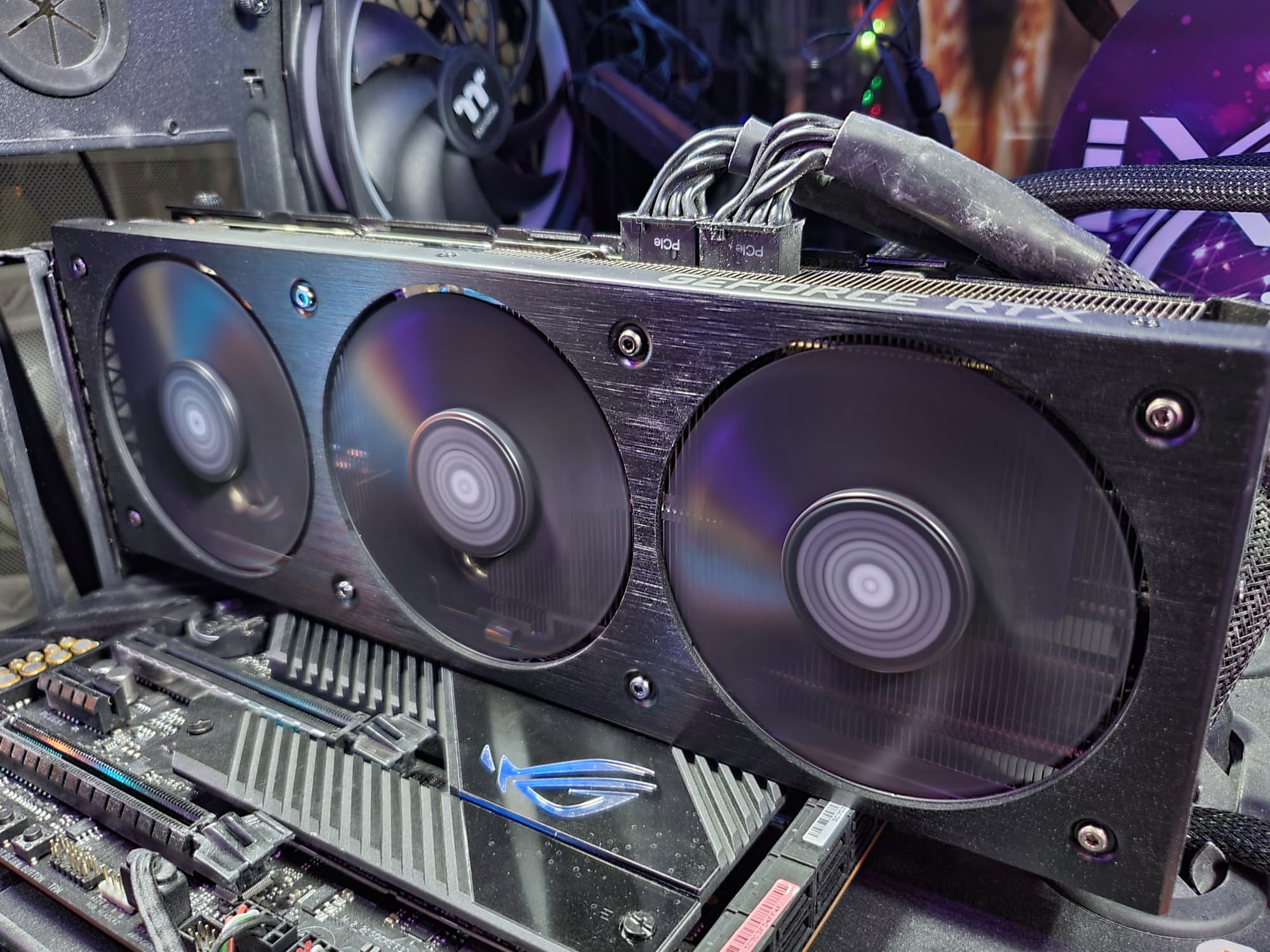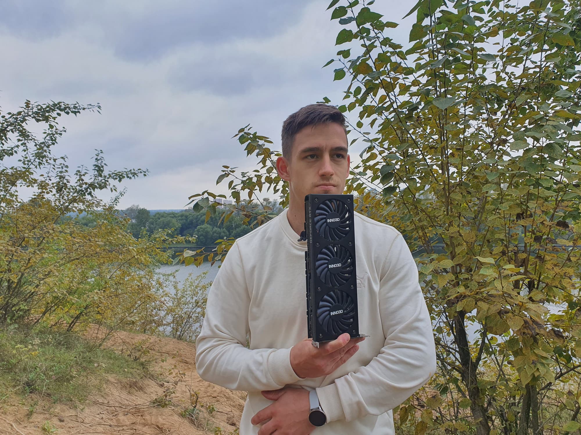 Систему охлаждения нельзя назвать тихой (ее слышно отчетливо, даже громко), но для двухслотового решения шум можно назвать приемлемым — вспомним хотя бы, как шумела референс-карта Nvidia. Однако нагрев компонентов все равно высокий, карта Inno3D может потреблять до 300 Вт. Потребуется хорошо вентилируемый корпус, потому что почти весь нагретый воздух видеокарта оставляет внутри системного блока.