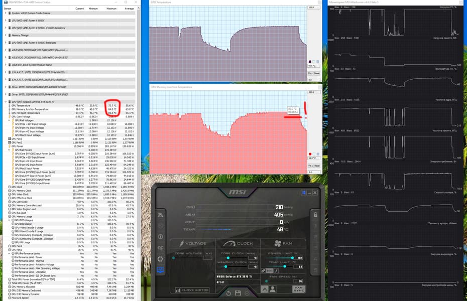 Если мы запускаем майнинг ETH с установками параметров работы карты по умолчанию, то температура нагрева памяти на карте поднимается до 82 градусов, что является приемлемым результатом.