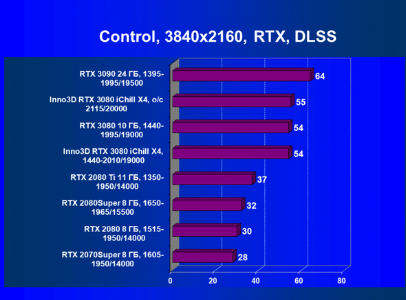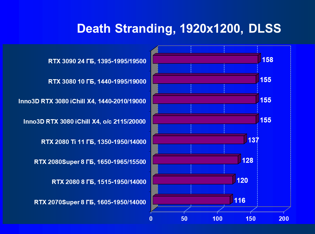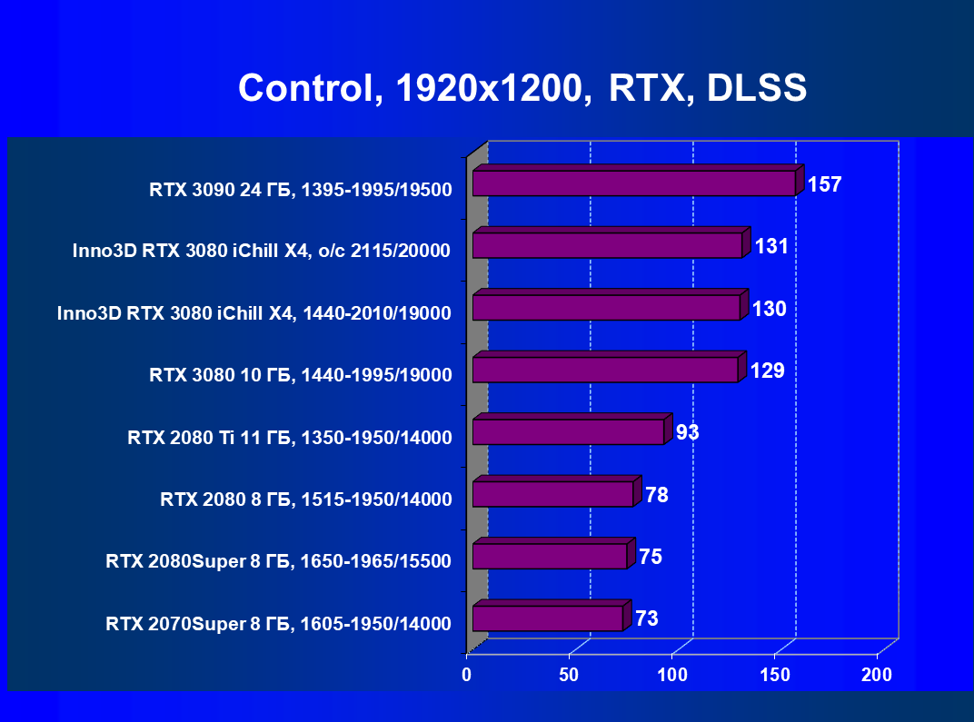 Желающие могут прочитать наши базовые обзоры GeForce RTX 3080 и GeForce RTX 3090, но и так ясно, что на сегодня это самые производительные ускорители 3D-графики. Однако GeForce RTX 3090 все же не является чисто игровым решением (его 24 ГБ памяти сейчас не востребованы даже в самых современных играх), так что если говорить о чисто игровых видеокартах, то GeForce RTX 3080 — лучшее, что есть на сегодняшний день. Разумеется, этот ускоритель нацелен на разрешение 4К при максимальном качестве графики в играх, в котором эта карта может обеспечить полный комфорт, а рассматриваемая сегодня видеокарта Inno3D еще чуть-чуть быстрее референсной Founders Edition. Если же у кого-то завалялся 8K-телевизор с поддержкой HDMI 2.1, то можно попробовать поиграть на нем в некоторые игры с включенным DLSS даже в таком разрешении.