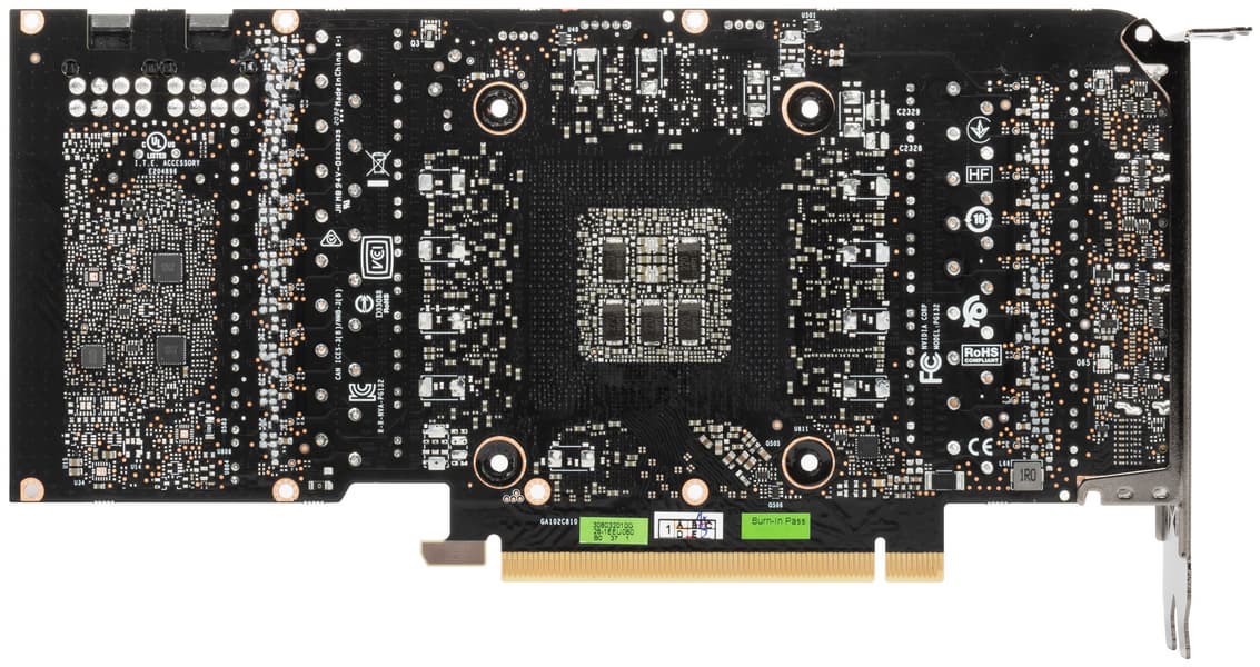 Карта имеет 10 ГБ памяти GDDR6X SDRAM, размещенной в 10 микросхемах по 8 Гбит на лицевой стороне PCB. Микросхемы памяти Micron (GDDR6X, MT61K256M32JE-19) рассчитаны на условную номинальную частоту работы в 4750 (19000) МГц. Расшифровщик кодов на упаковках FBGA находится здесь.
