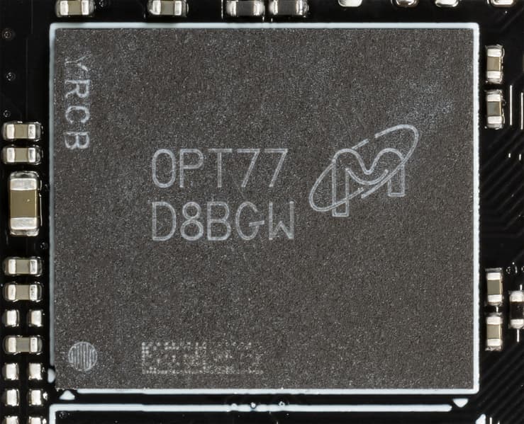 На лицевой же стороне имеется третий ШИМ-контроллер uP9512R, который управляет 3-фазной схемой питания микросхем памяти.