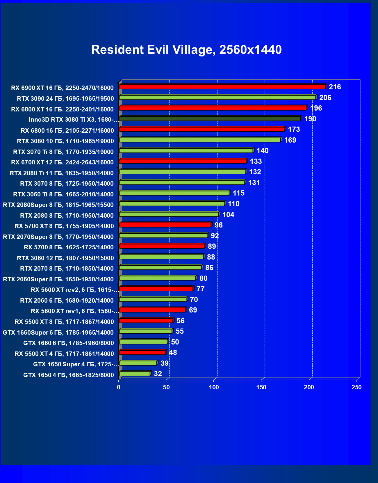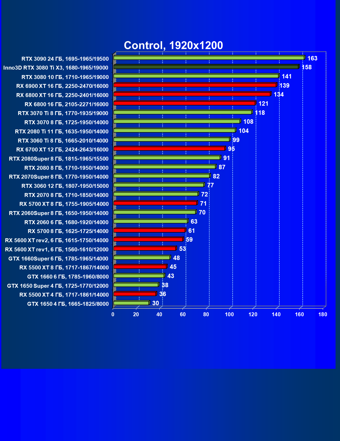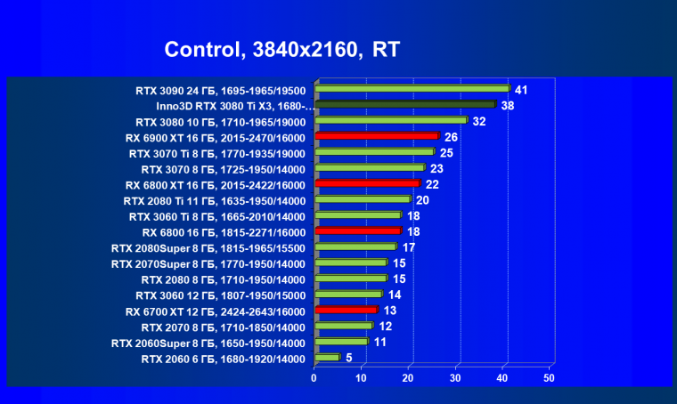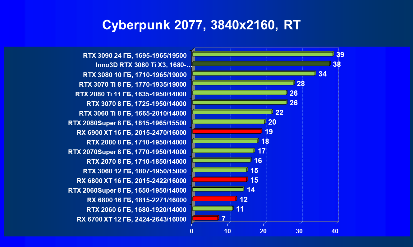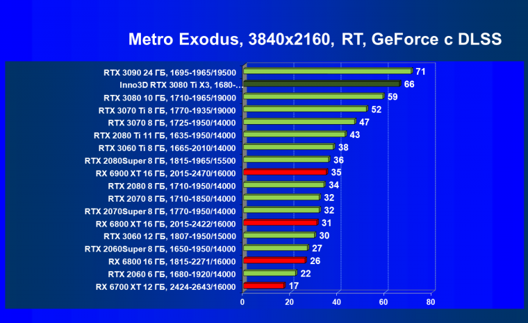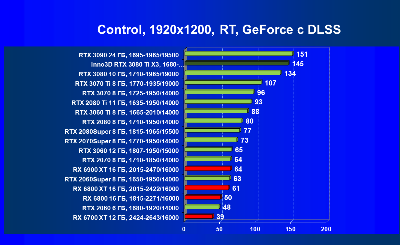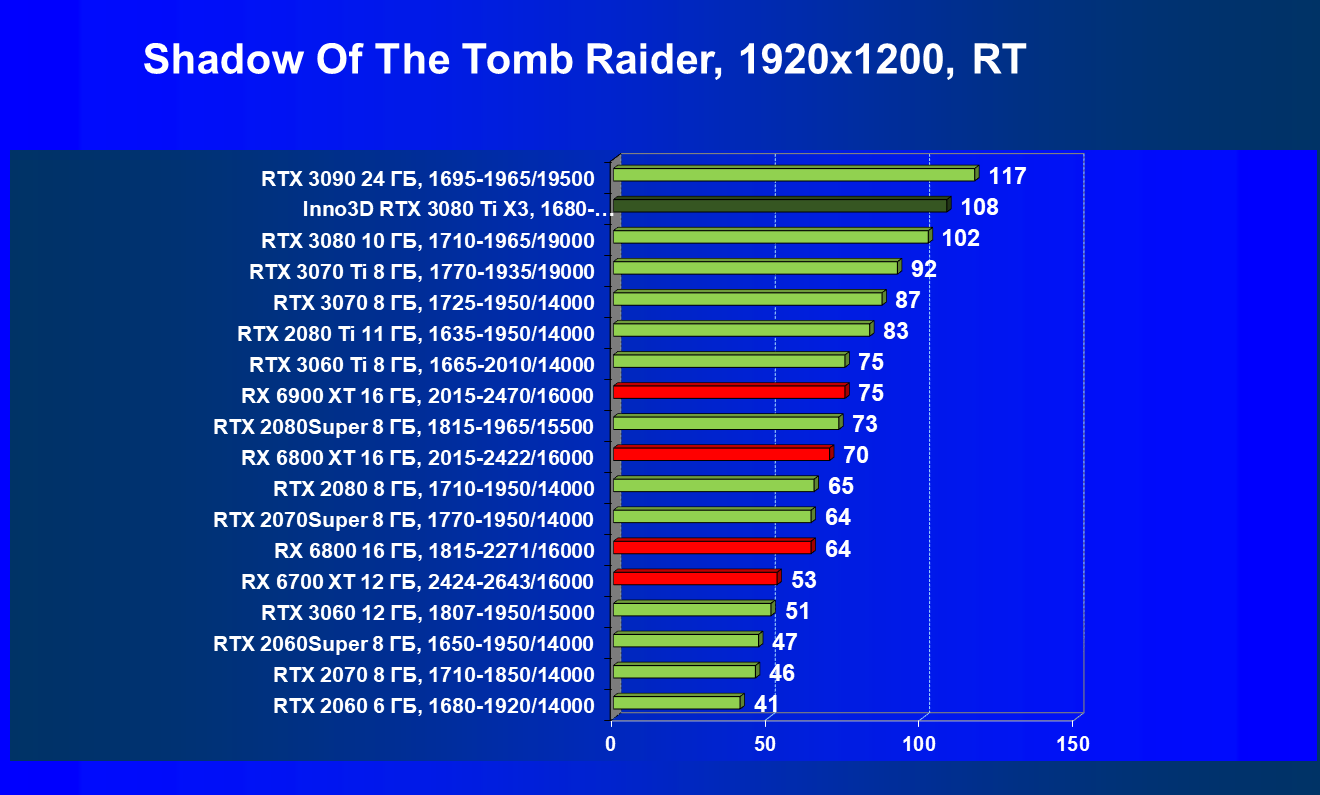 Все Radeon RX 6000 оказались аутсайдерами из-за чрезмерного падения производительности в играх с трассировкой лучей, а GeForce RTX 3080 Ti логично оказался посередине между GeForce RTX 3080 и GeForce RTX 3090.