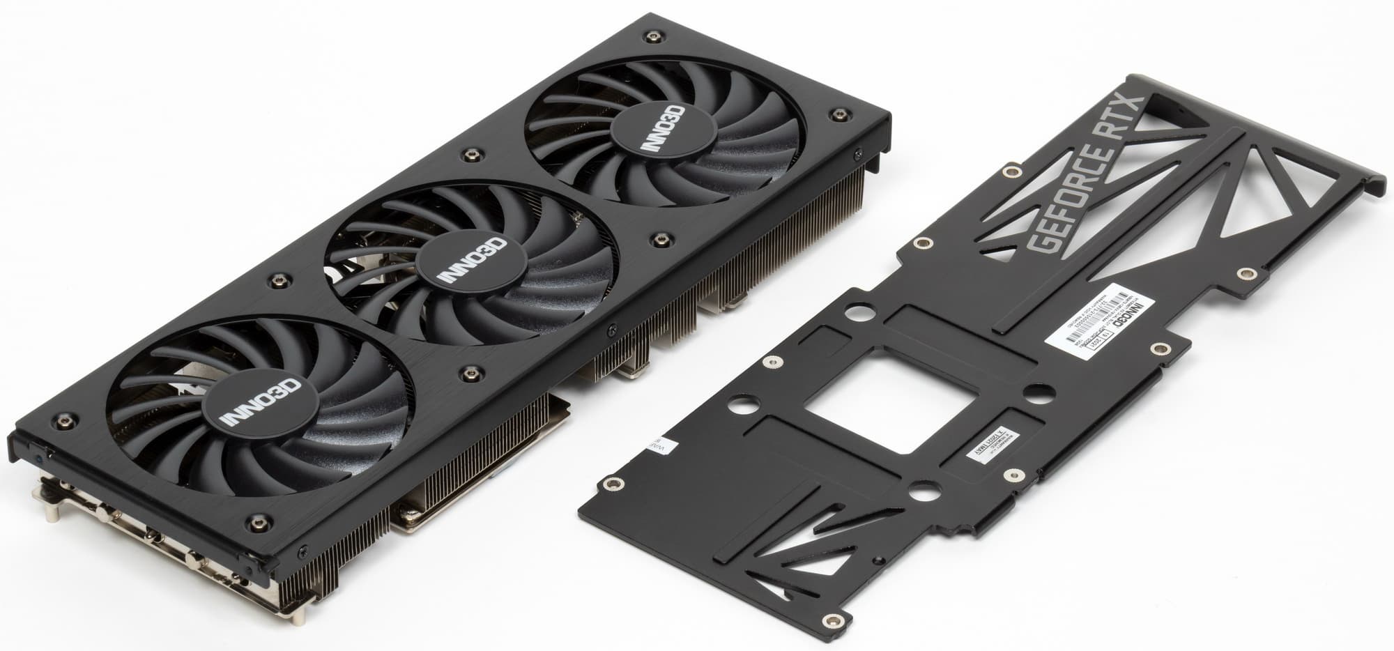 Систему охлаждения нельзя назвать тихой, но для двухслотового решения шум очень низкий — вспомним, как шумела референс-карта Nvidia. Оборотной стороной является высокий нагрев компонентов, потому что карта Inno3D может потреблять до 350 Вт. Потребуется хорошо вентилируемый корпус, потому что весь нагретый воздух видеокарта оставляет внутри системного блока.