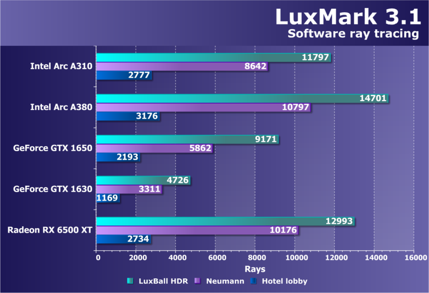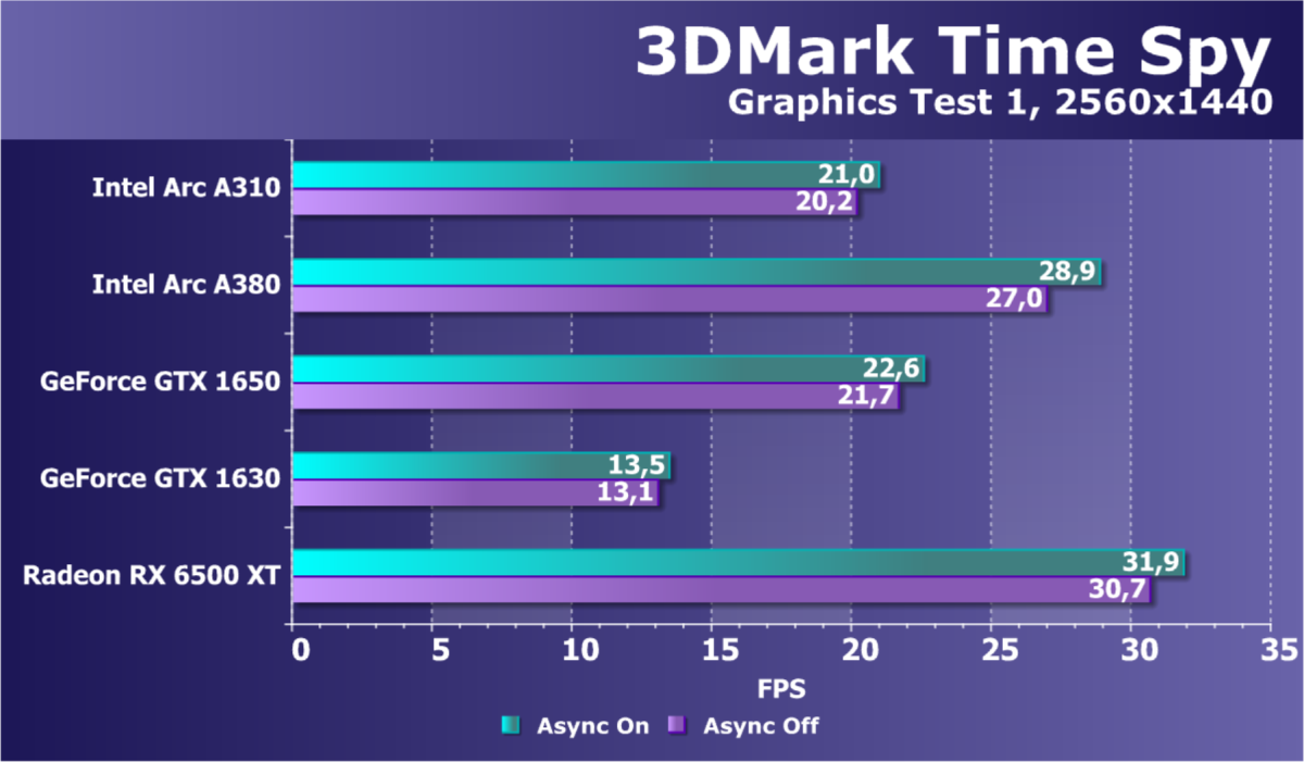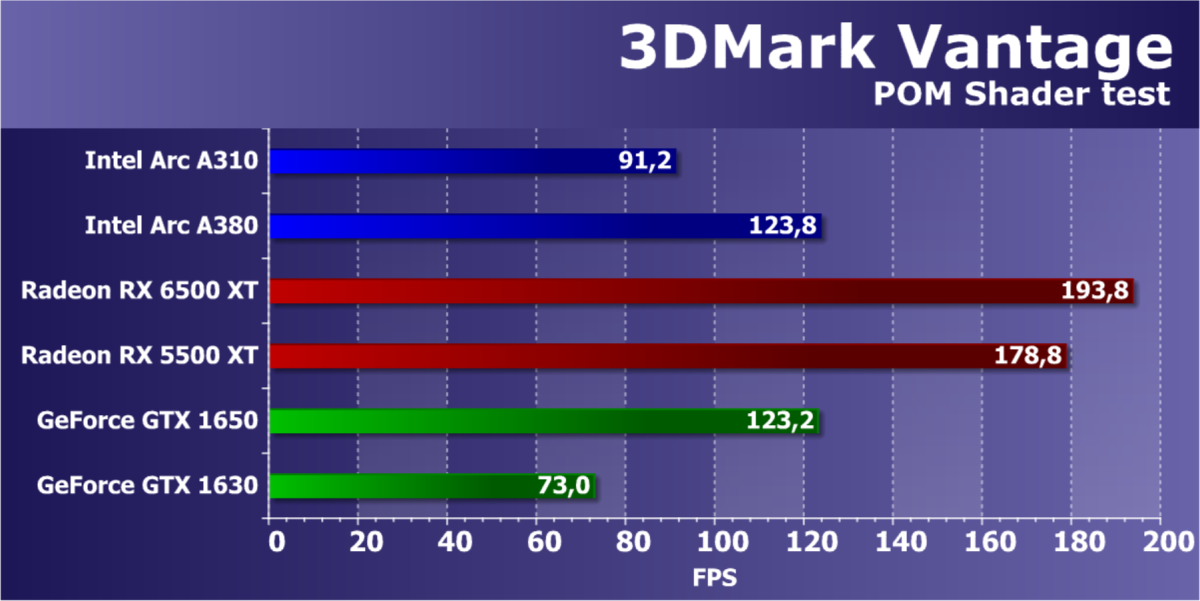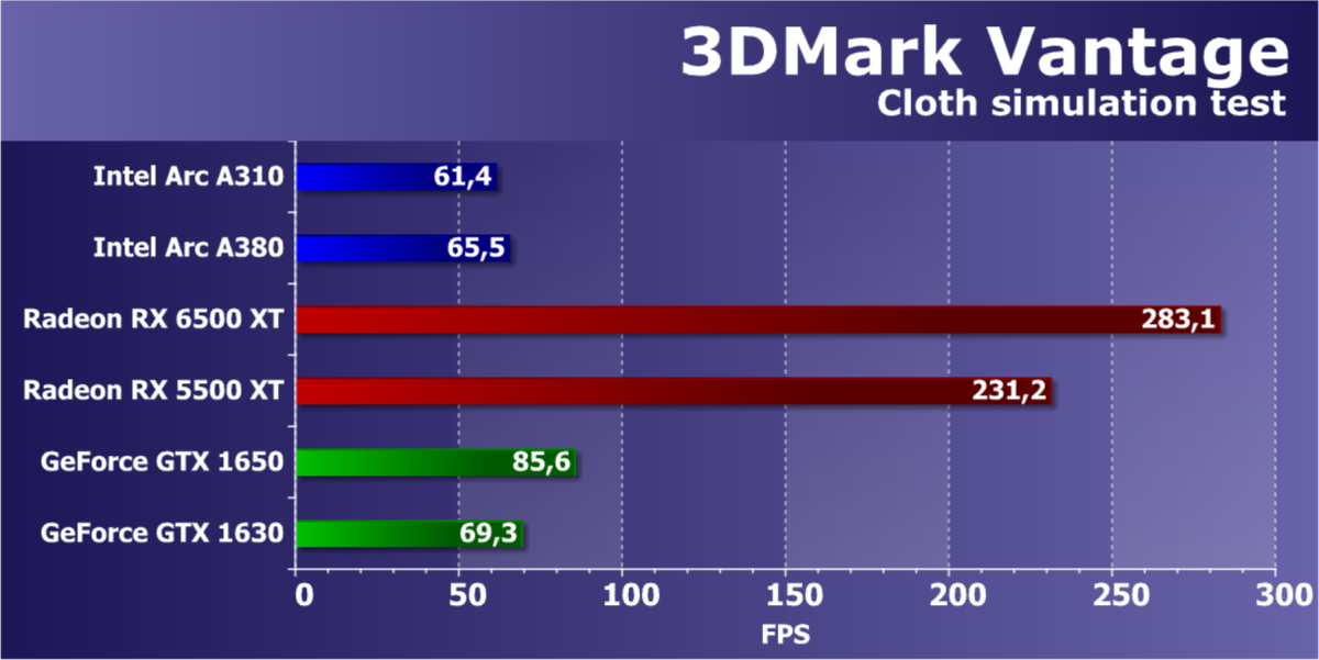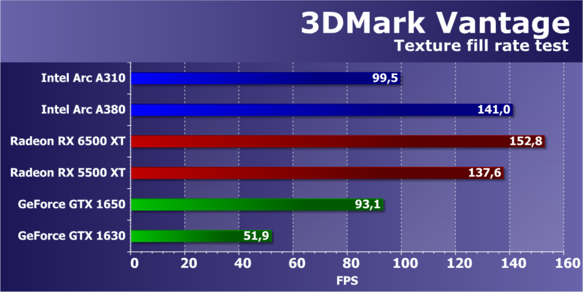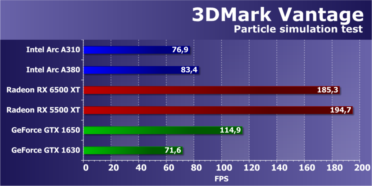 Arc A310 проигрывает даже таким очень старым ускорителям, как GeForce GTX 1050 Ti и GeForce GTX 1060 (6 ГБ). Однако он всё же оказался быстрее, чем не так давно непонятно зачем выпущенный GeForce GTX 1630.