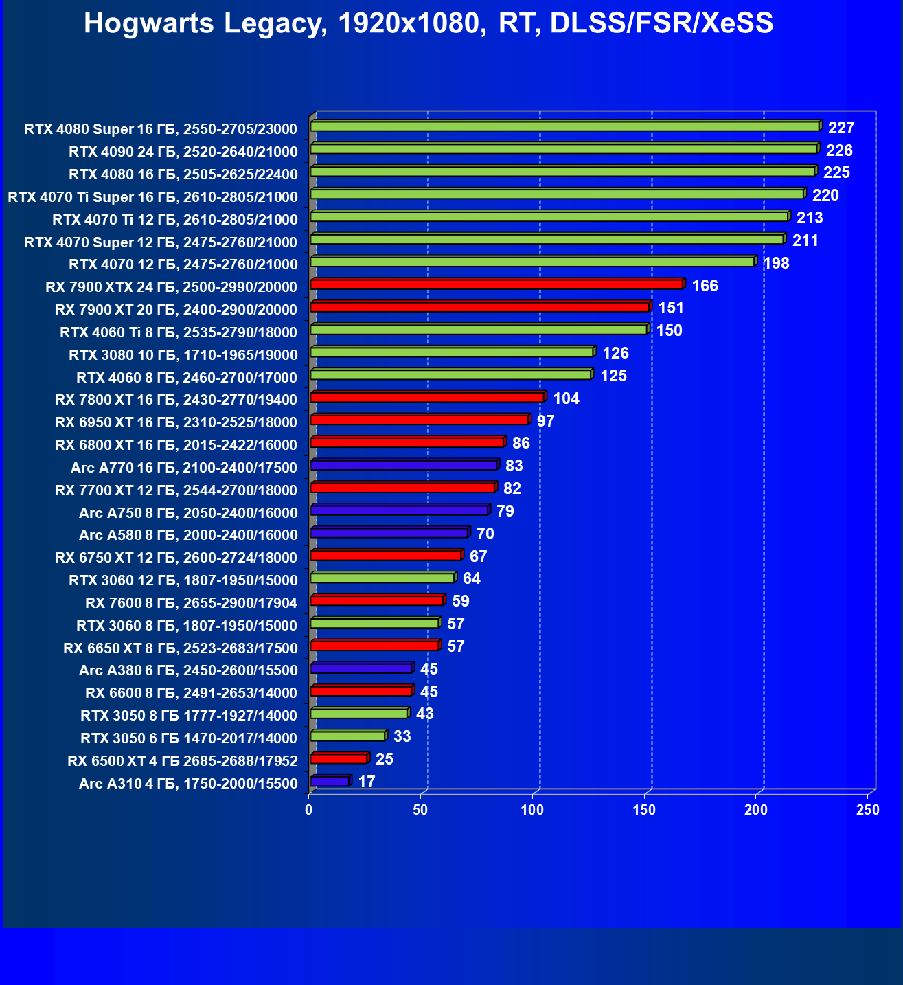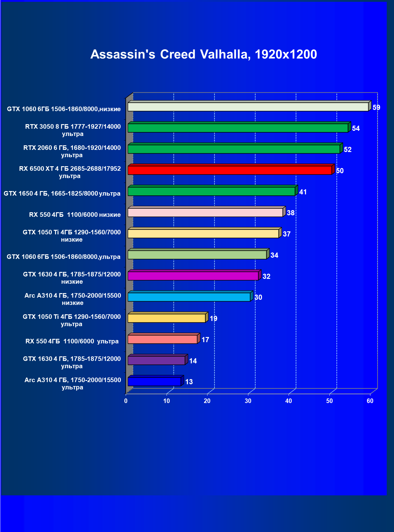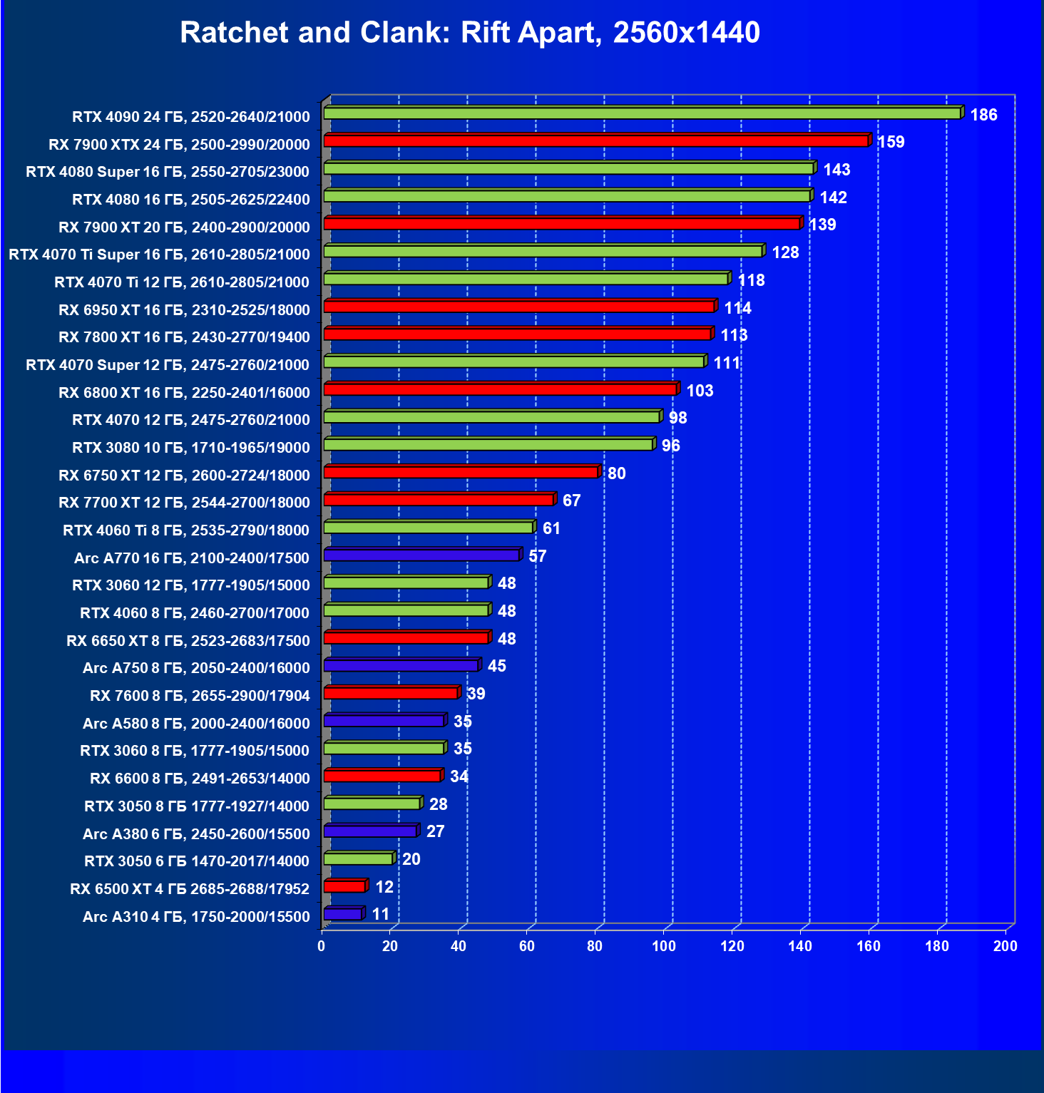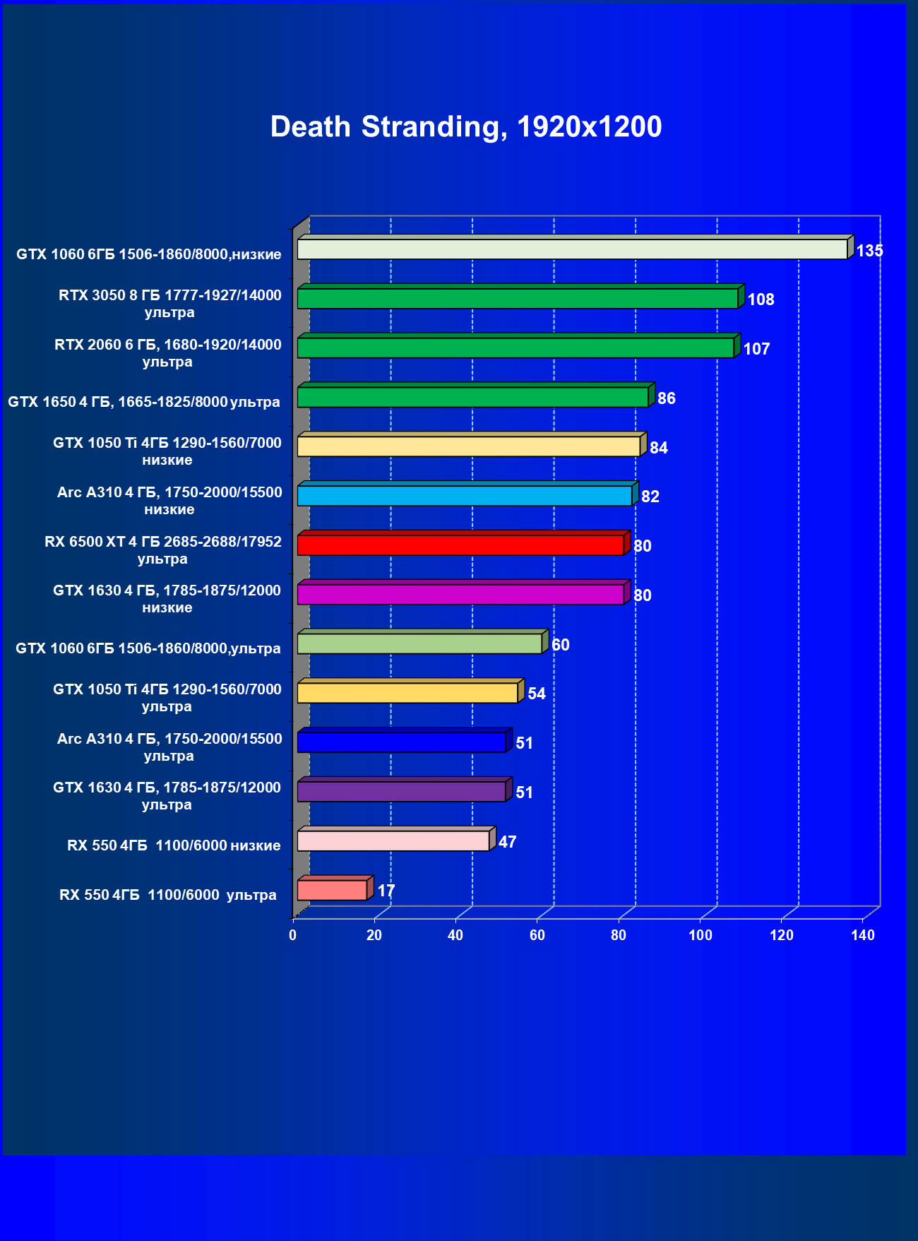 | 08 | Arc A310 4 ГБ, 1750—2450/15500, настройки ультра | 186 | 223 | 12 000 |