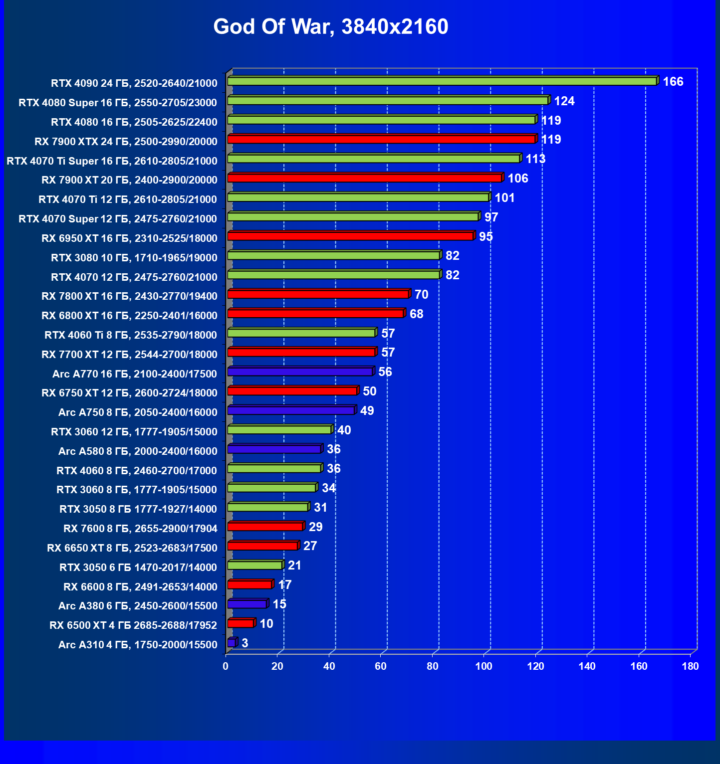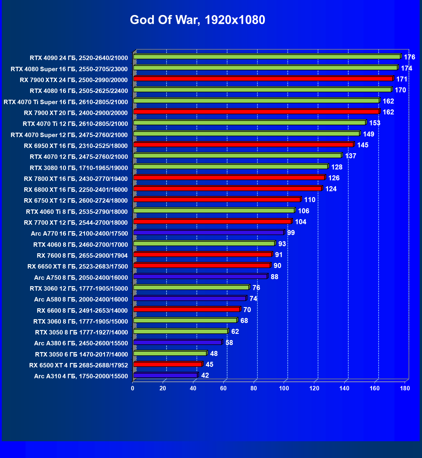 | 04 | Arc A310 4 ГБ, 1750—2450/15500, низкие настройки | 147 | 176 | 12 000 |