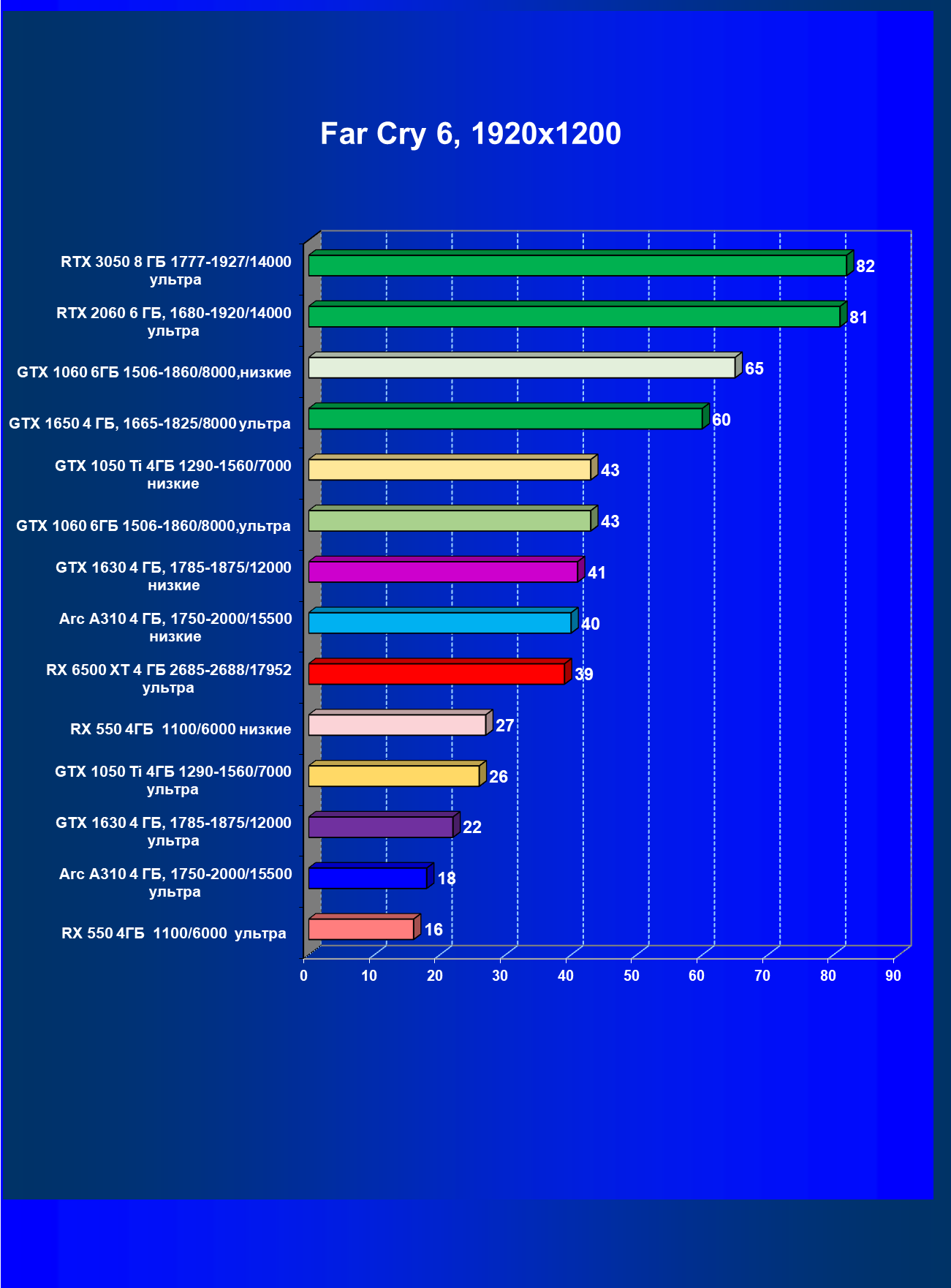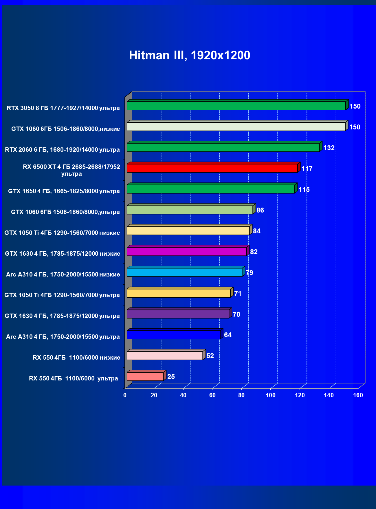 | 04 | GTX 1630 4 ГБ, 1785—1875/12000, низкие настройки | 166 | 111 | 15 000 |