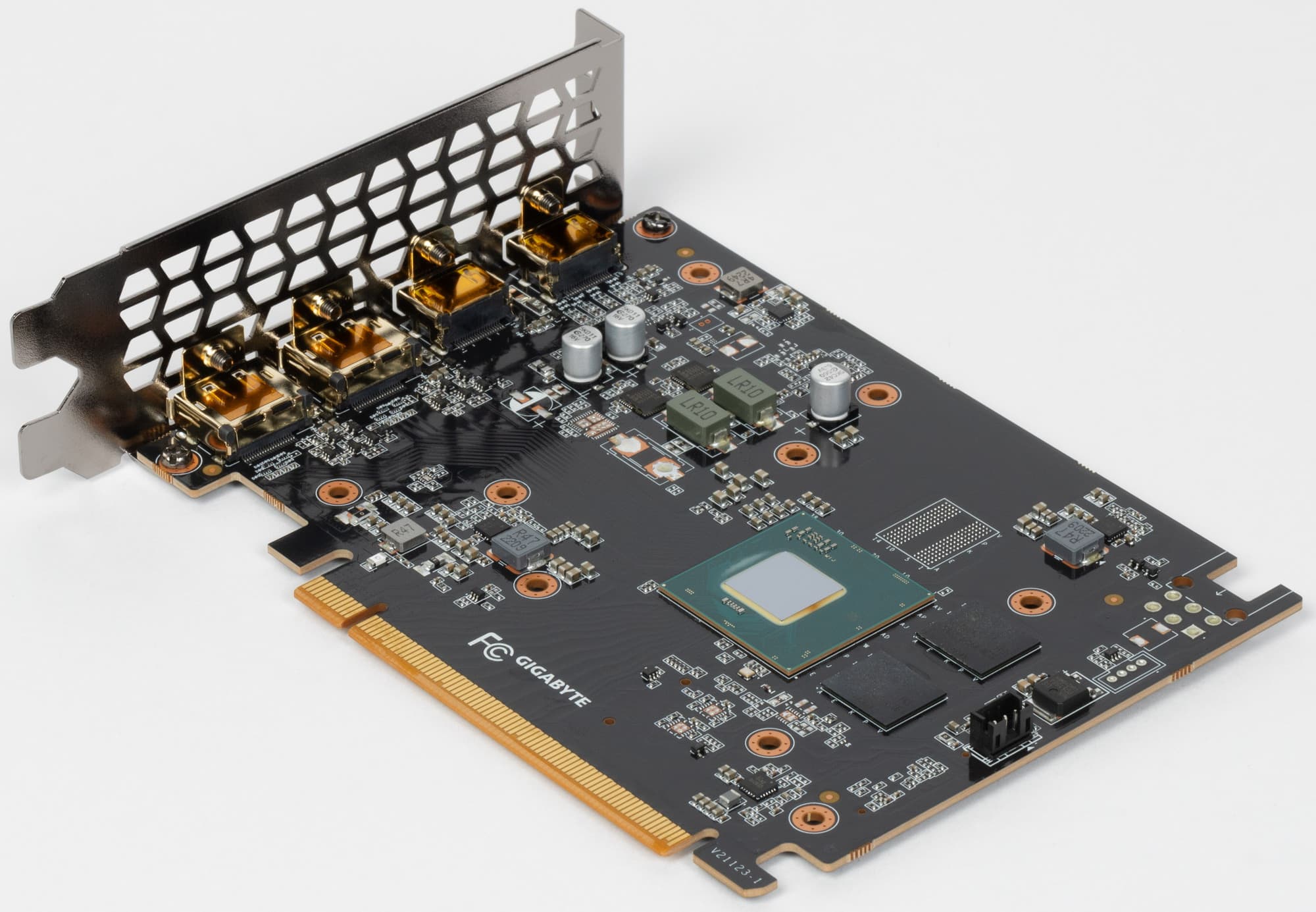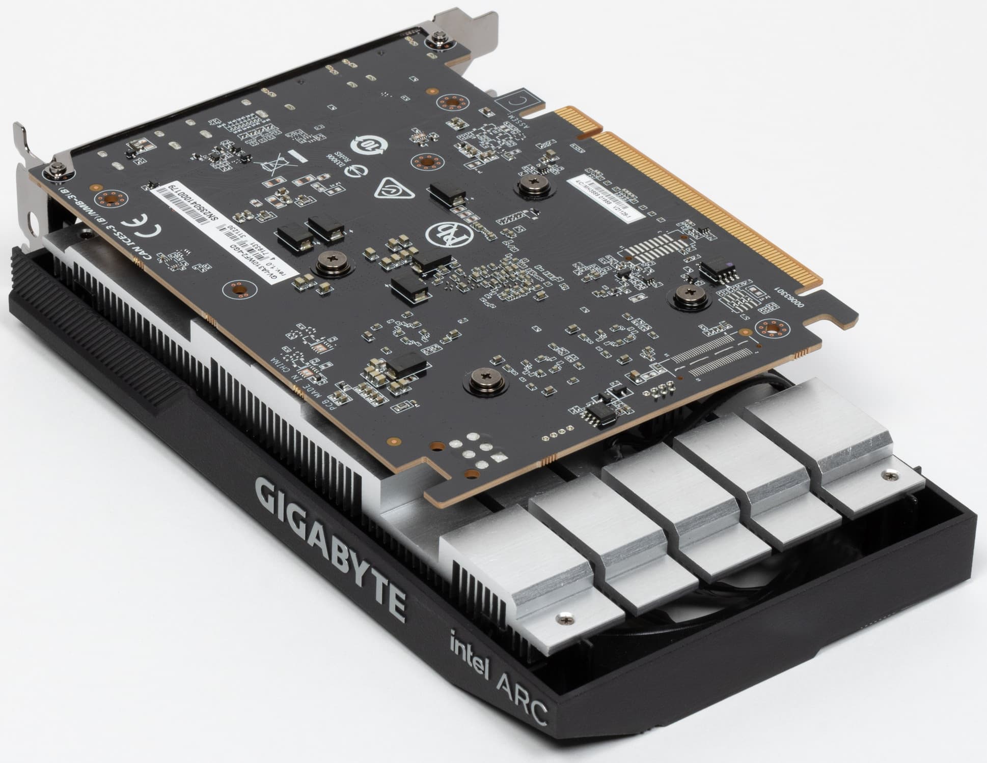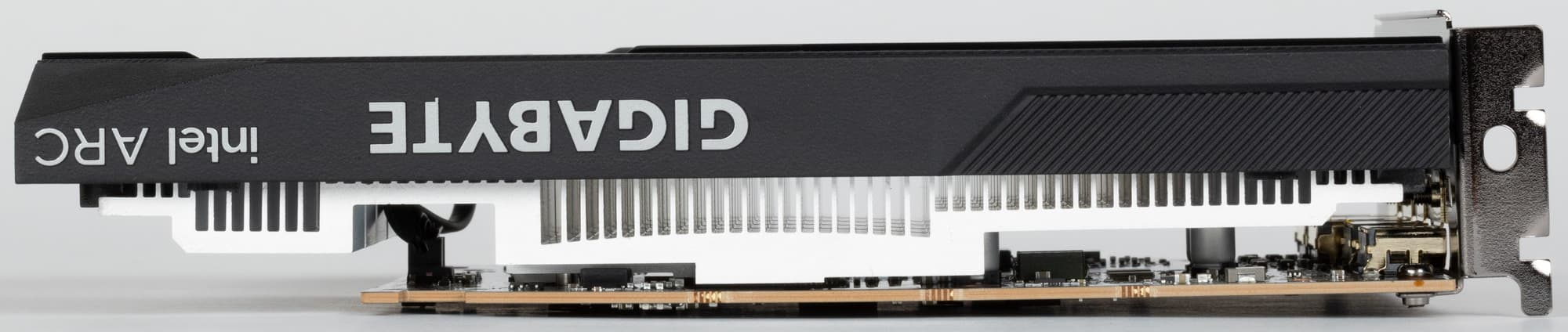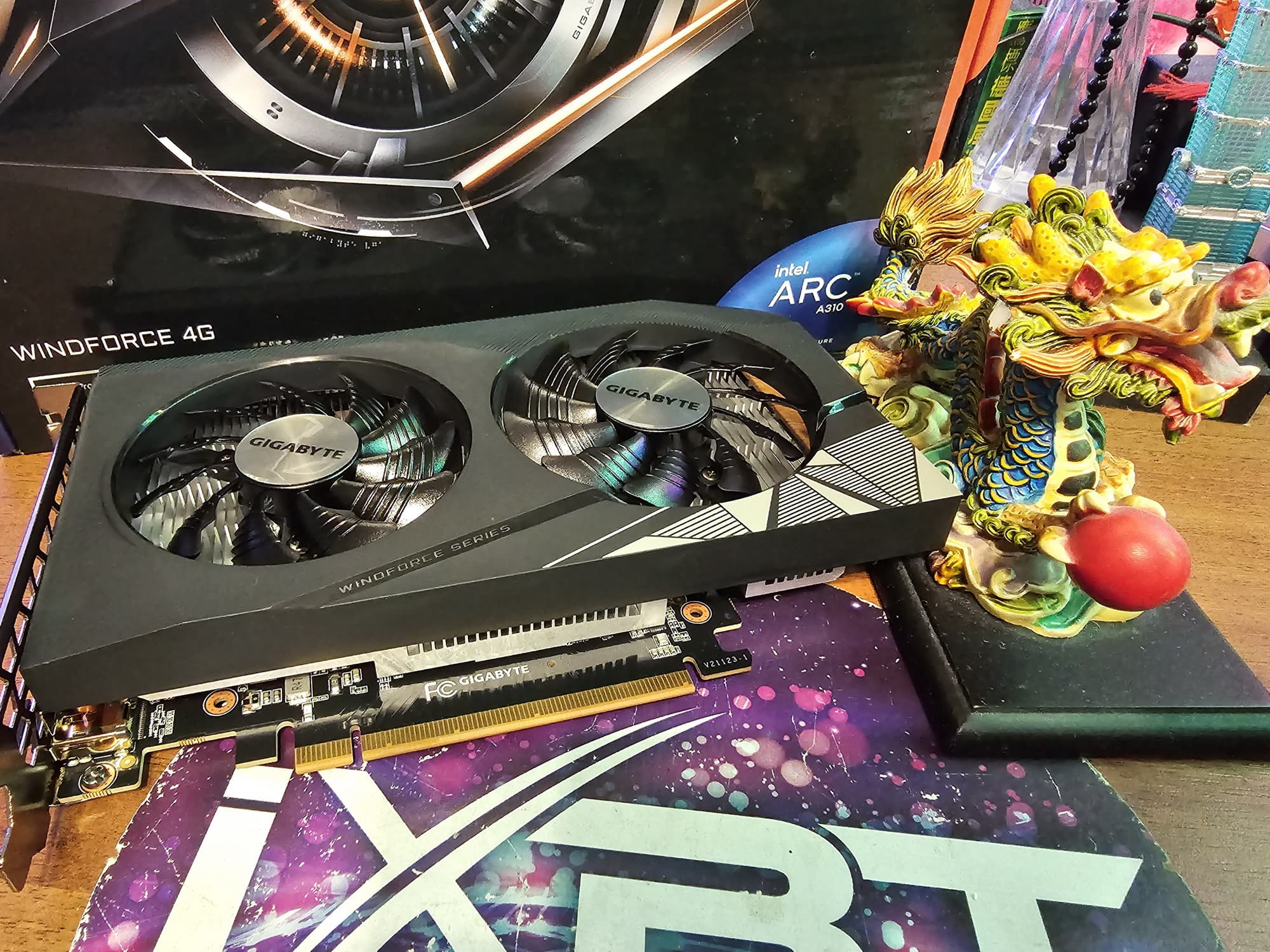 Конкретная протестированная карта Gigabyte Intel Arc A310 WindForce 4G (4 ГБ) имеет стандартный двухслотовый размер, кулер тихий и эффективный, карта может потреблять до 38 Вт и не требует дополнительного питания.