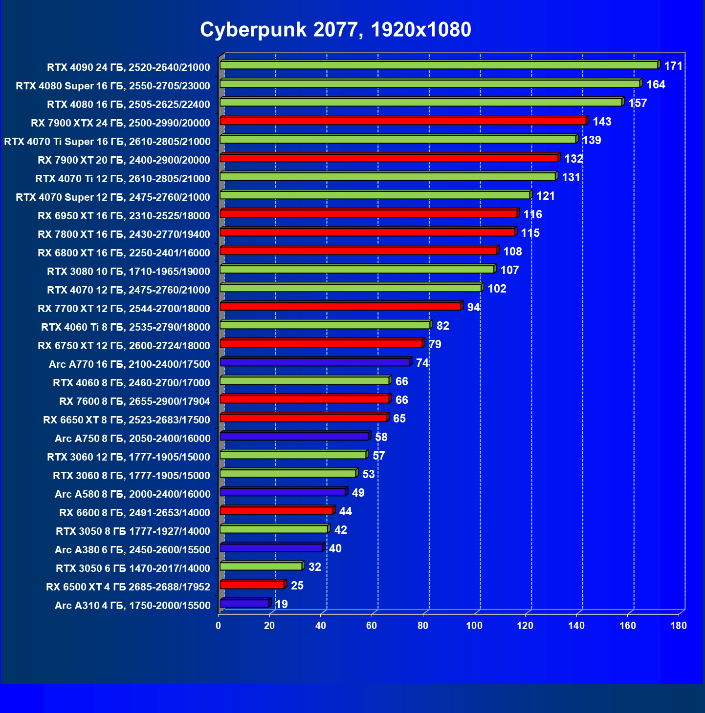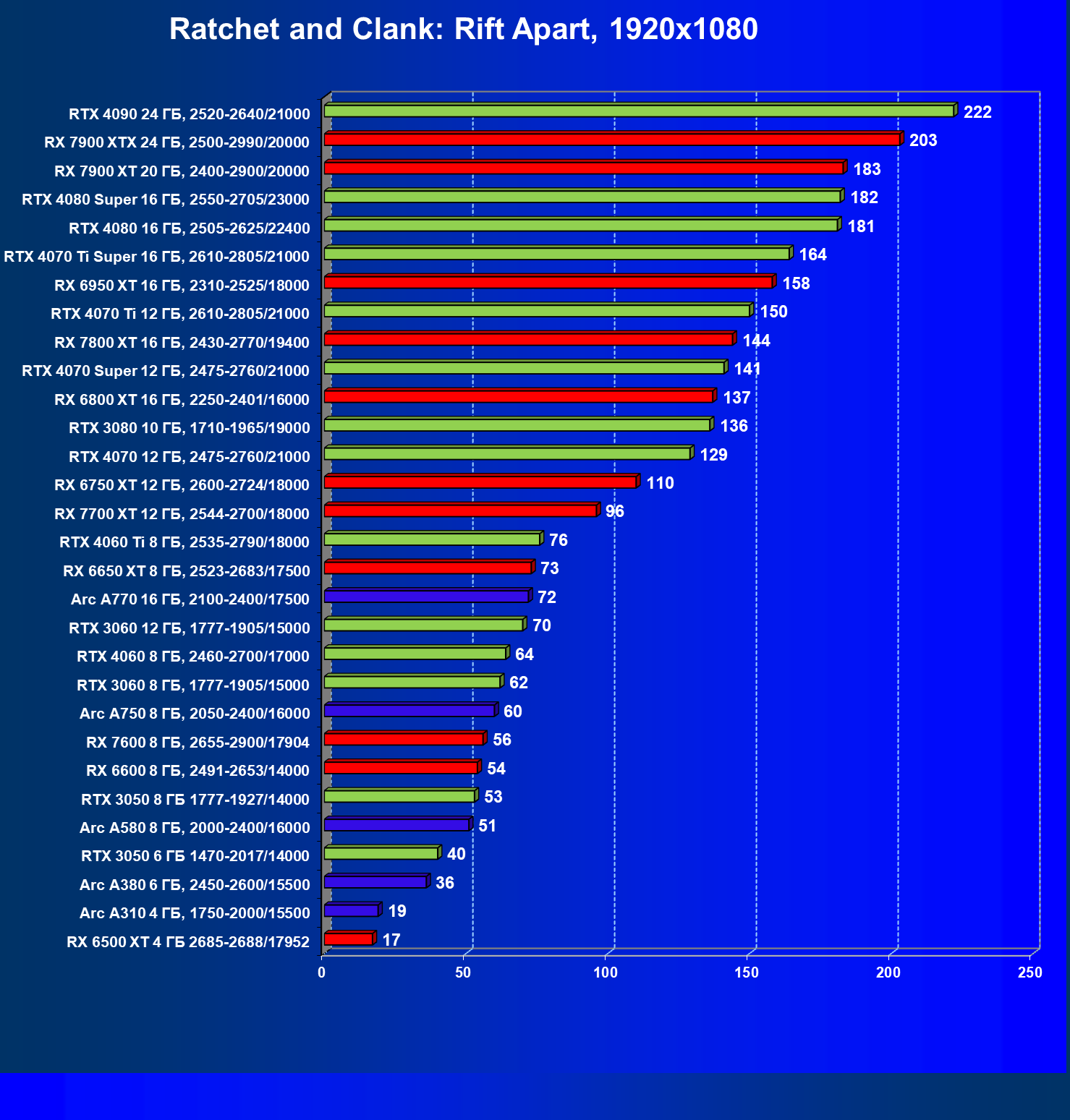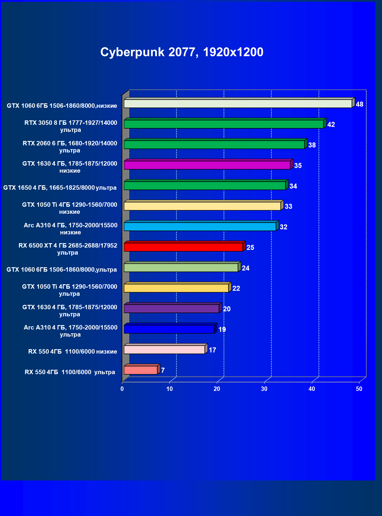 | 07 | Arc A310 4 ГБ, 1750—2450/15500, настройки ультра | 223 | 186 | 12 000 |