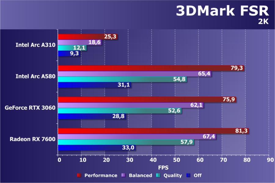 Упомянем еще раз, что карта на базе Arc A310 пригодна для классических игр в разрешении никак не выше Full HD, но в таком разрешении многие игры потребуют снизить настройки качества графики до средних или даже низких. Если игра поддерживает технологии масштабирования Intel XeSS или AMD FSR, то их включение крайне рекомендуется. Поддержка трассировки лучей в случае Arc A310 является чисто формальной, производительности ускорителя не хватит для ее практического применения.